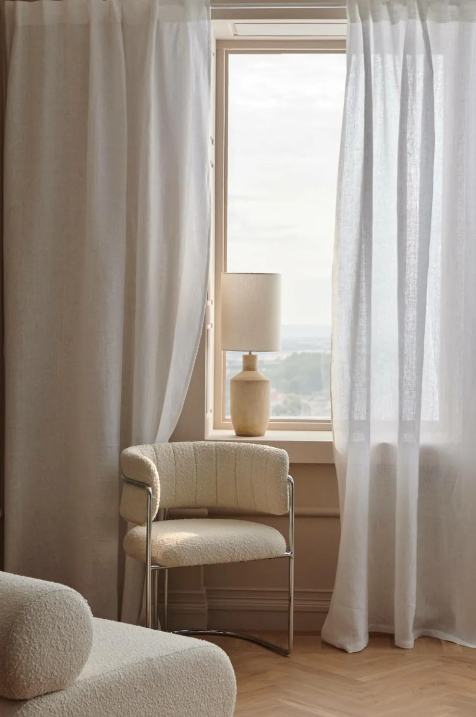 To multibåndsgardiner af hør i vasket, tynd vævet kvalitet. Multibåndet gør, at du enten kan hænge gardinerne direkte på en gardinstang eller anvende ringe og nålekroge (ikke fingerkroge). Snore i rynkebåndet gør at du let kan skabe ensartede, flotte læg. Bredde 145 cm. Findes i flere forskellige længder.