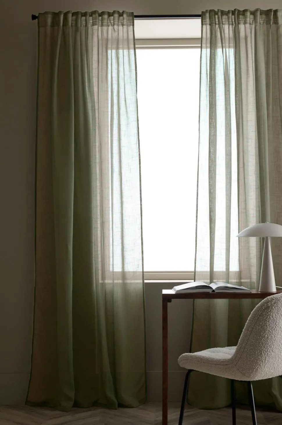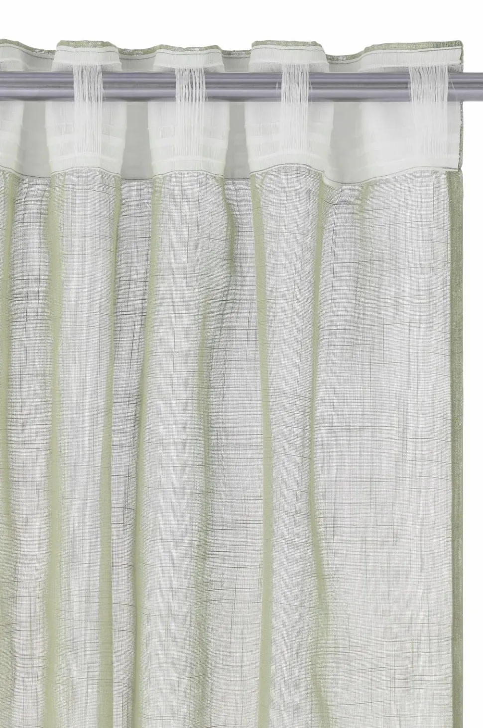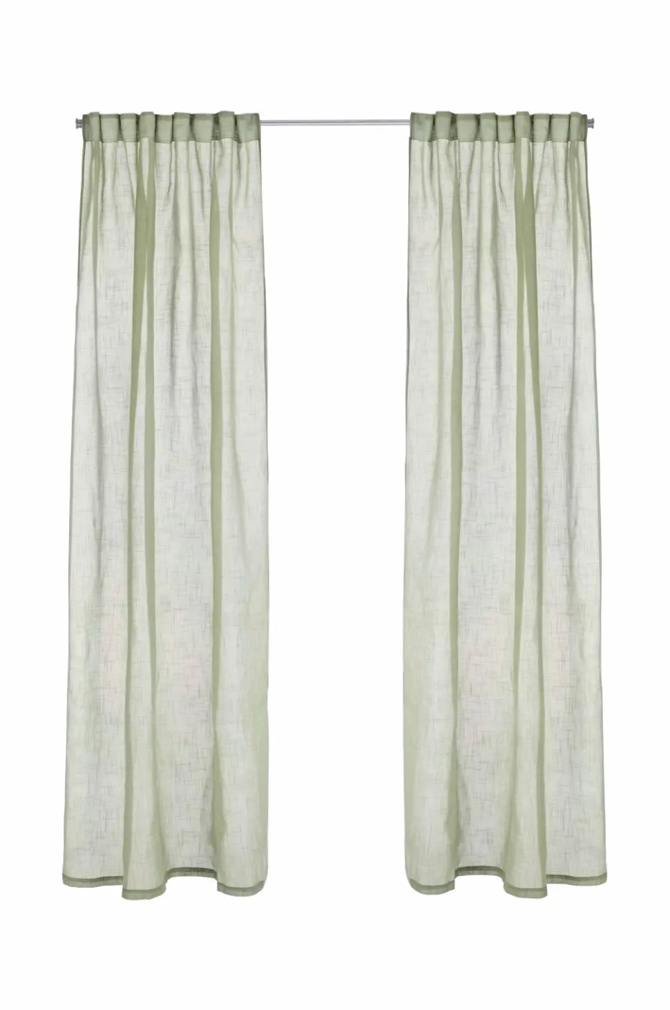 To gardiner med multibånd i luftig kvalitet med let struktur i hørlook. Multibåndet gør, at du enten kan hænge gardinerne direkte på en gardinstang gennem de skjulte stropper eller anvende ringe, nålekroge, rynkebåndskroge eller fingerkroge. Snoren i rynkebåndet gør, at du let kan skabe ensartede, flotte læg. Bredde 134 cm. Tre længder: 220, 250 og 300 cm.