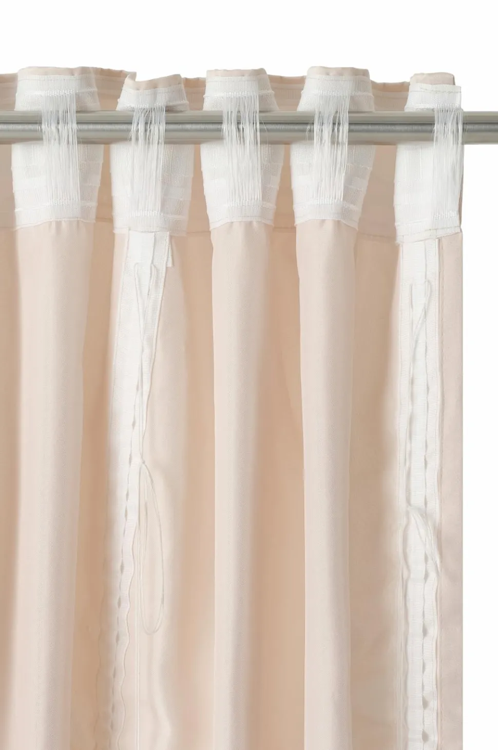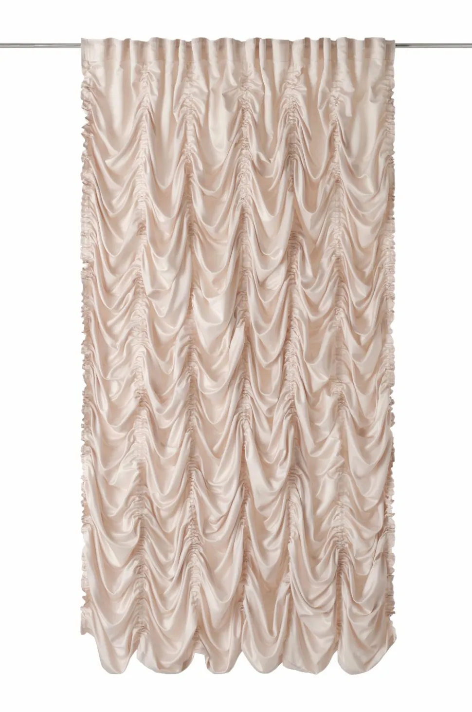 • Gardinet har indsyede lodrette snore, som gør det muligt at trække det op og skabe stilfulde, draperede effekter. Gardinet kan trækkes op til maksimalt ca. 60 cm. Snorene kan skjules i folden i bunden.