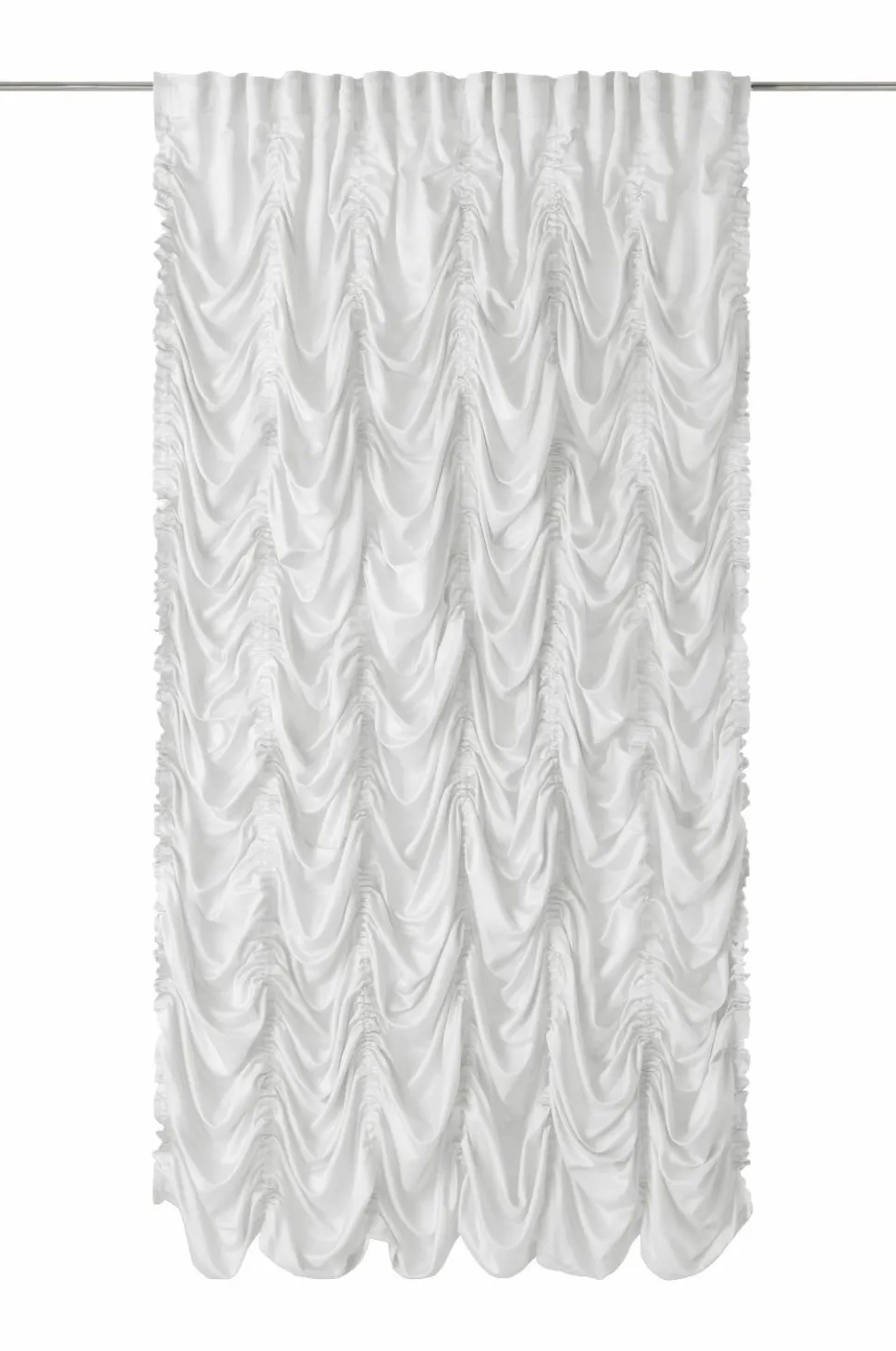 • Gardinet har indsyede lodrette snore, som gør det muligt at trække det op og skabe stilfulde, draperede effekter. Gardinet kan trækkes op til maksimalt ca. 60 cm. Snorene kan skjules i folden i bunden.