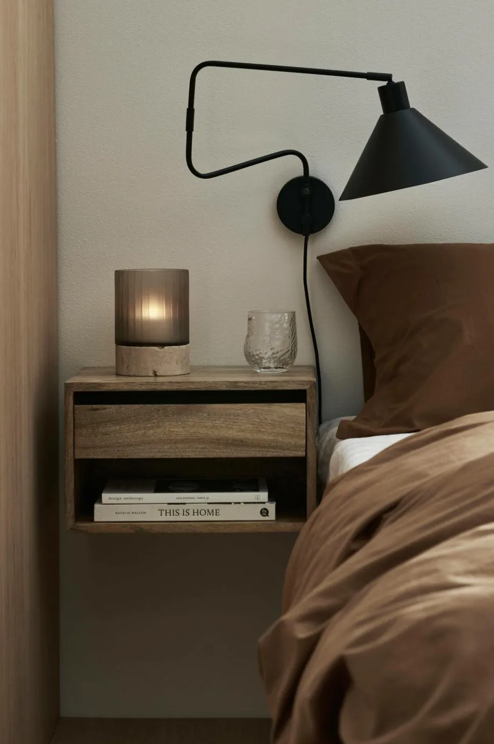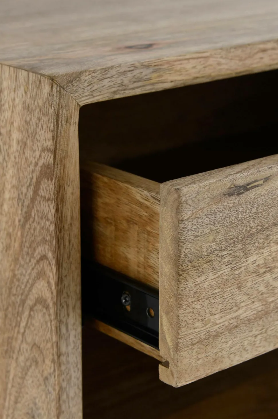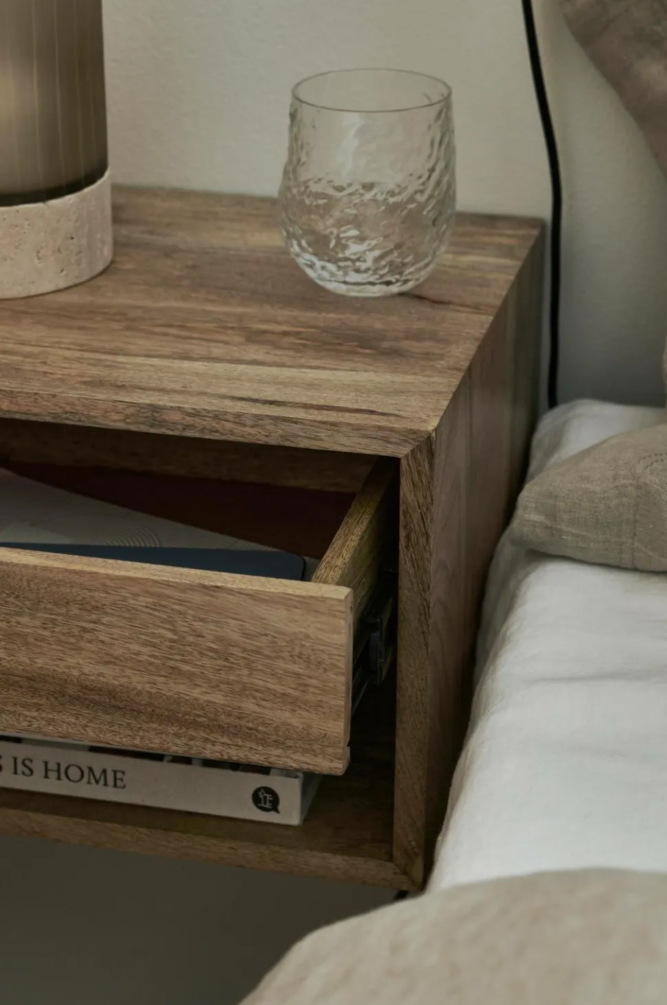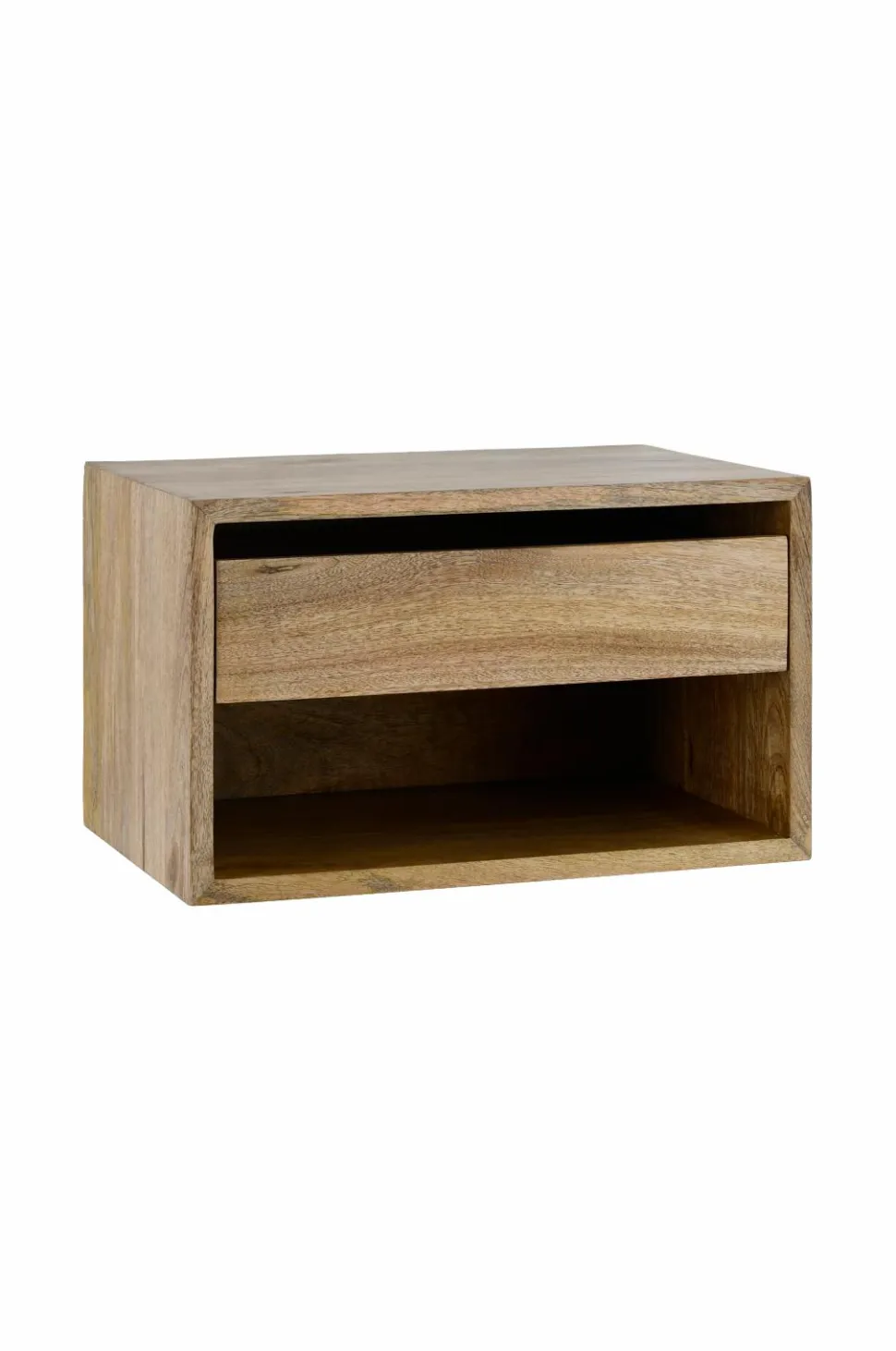 Natbord/opbevaringshylde af massivt mangotræ. Monteres på væg med beslag i metal på bagsiden. En udtrækkelig skuffe og et åbent rum. Højde på rum 10 cm og højde på skuffe 10 cm. Produktet indeholder FSC-certificeret træ, som er fældet i et ansvarsfuldt skovbrug, der tager hensyn til mennesker og miljø.