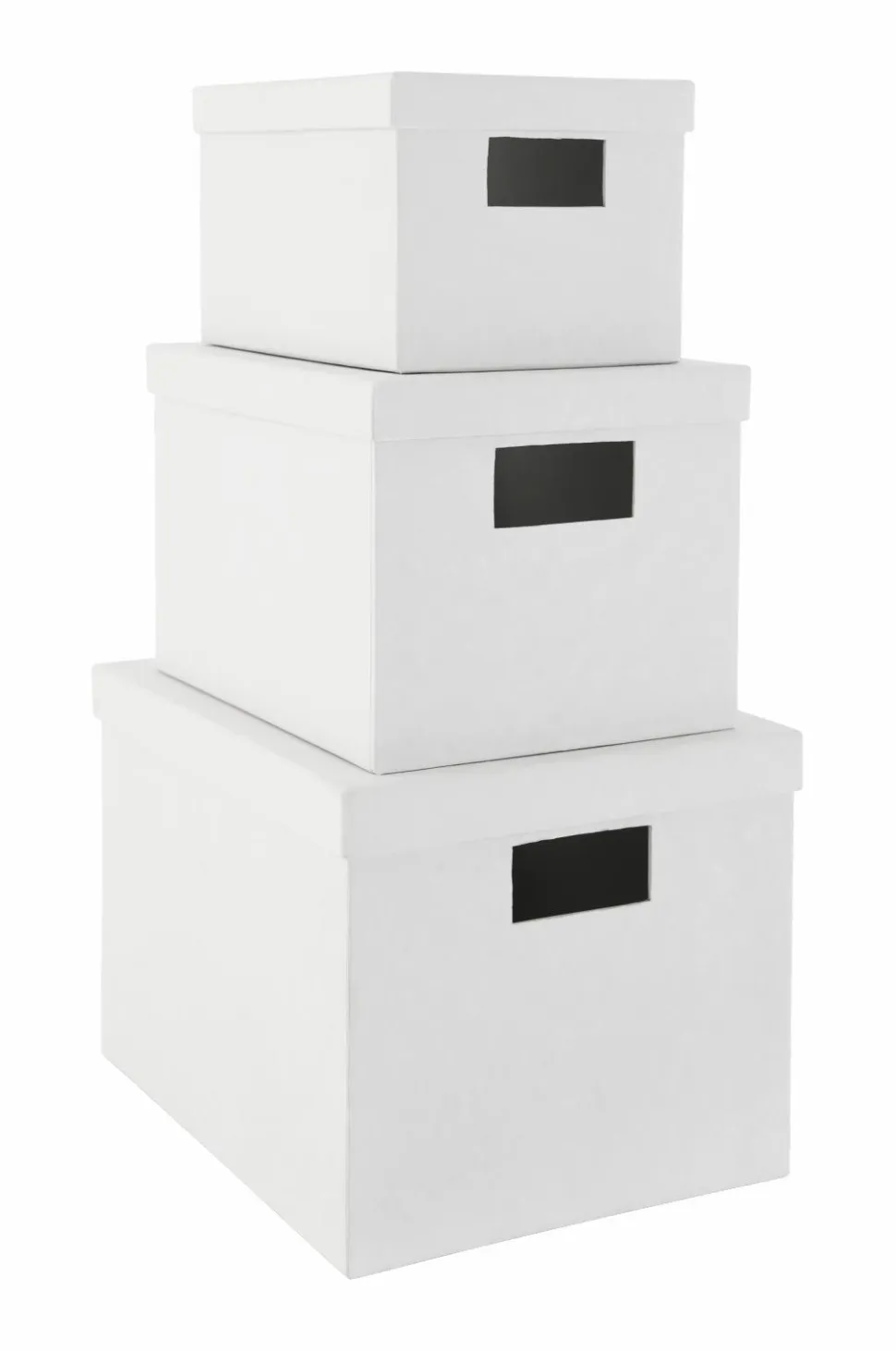 3 stk. opbevaringsbokse i forskellige størrelser med låg. Af genindvundet, håndlavet papir/karton.