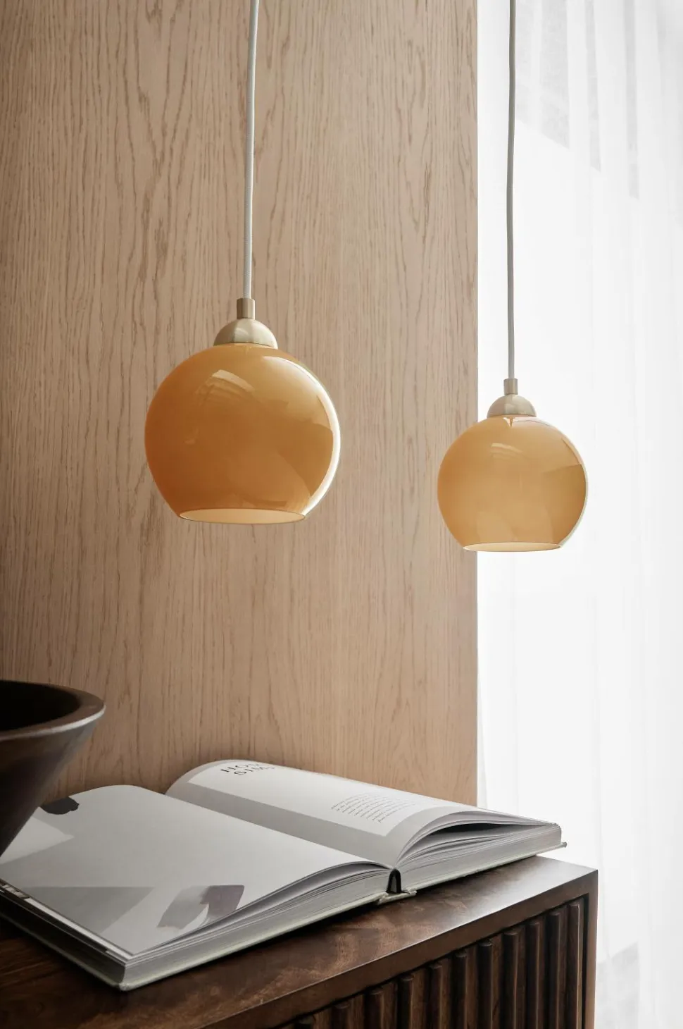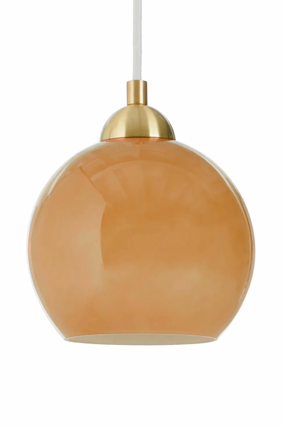Pendel af malet, blankt glas. Detaljer i metal med børstet messingfinish. Stofledning med afbryder og stik. Pære medfølger ikke.