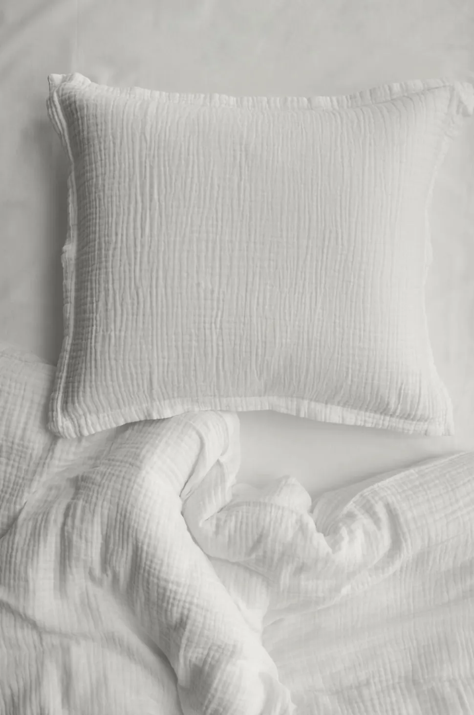 Pudebetræk af vasket, økologisk bomuldsmuslin i 2 lag. 2,5 cm vinge rundt om. Trådtal: 230 TC.