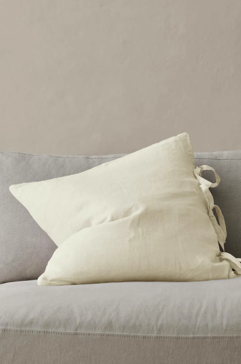 Pudebetræk i blød, vasket hørkvalitet med vintagelook. Af fransk hør. Tre par bindebånd i den ene kant. Str. 50×50 cm.