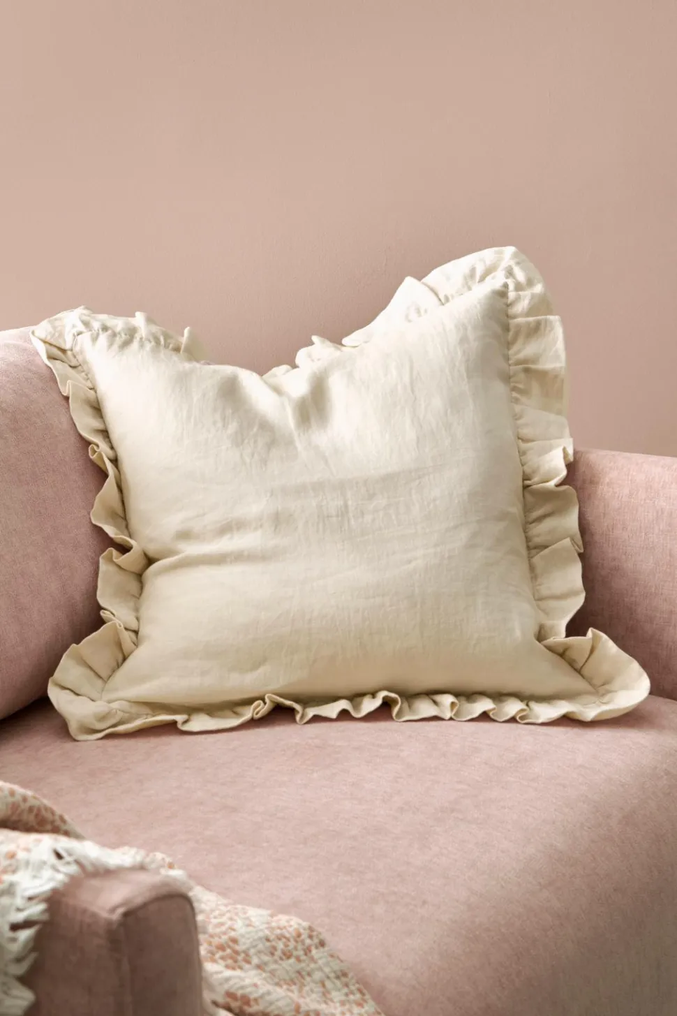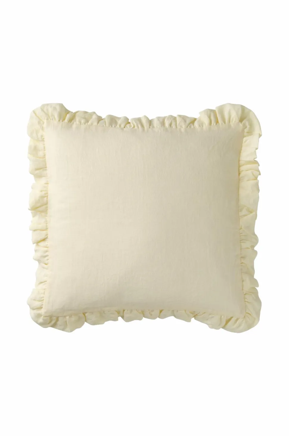 Pudebetræk i blød, vasket hørkvalitet af fransk hør. Flæse rundt om og lynlås bagpå. Str. 50×50 cm + 4,5 cm flæse.