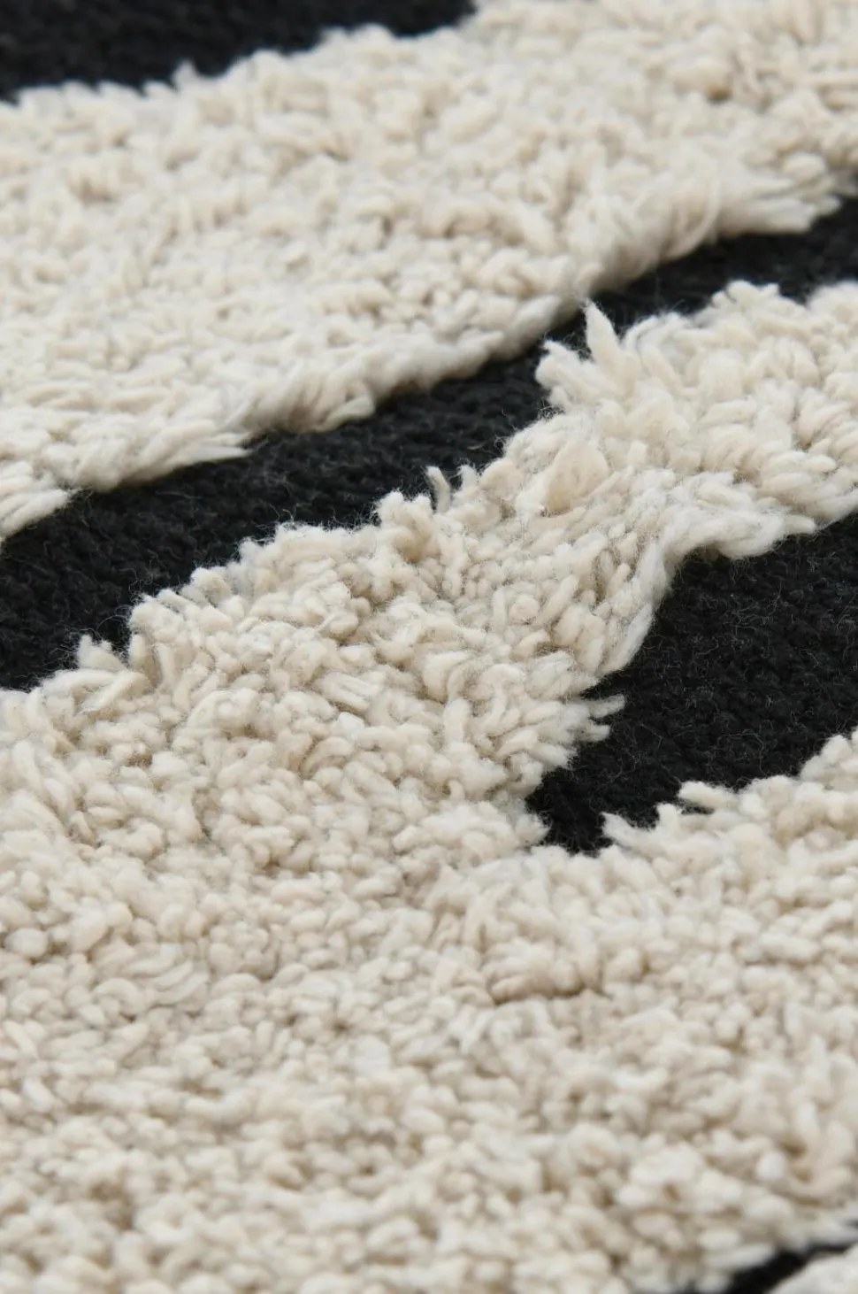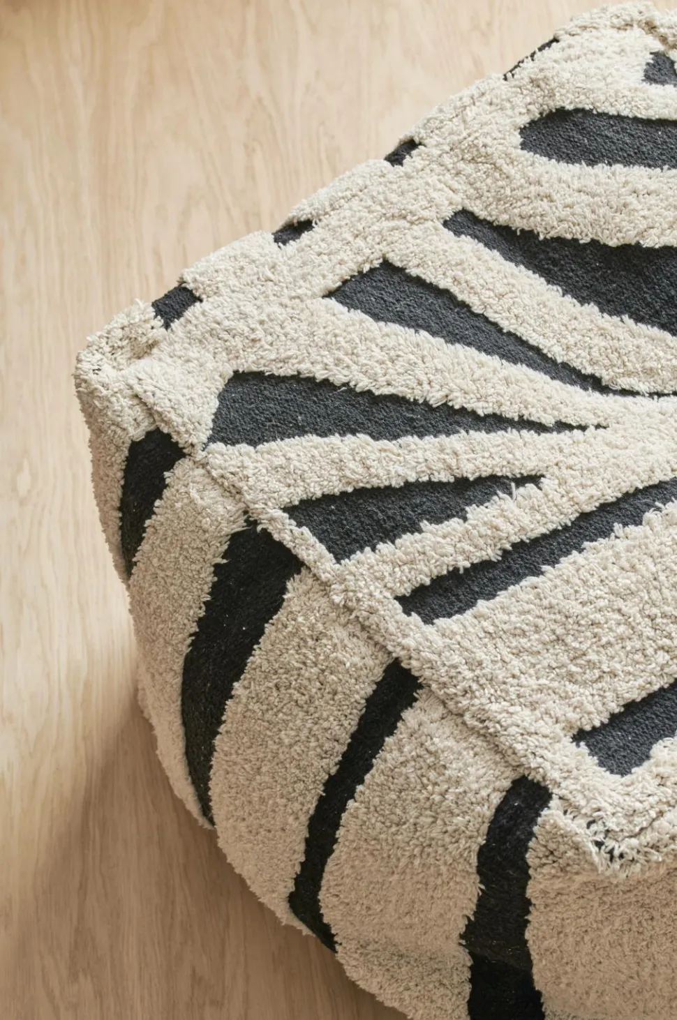 Puf med betræk i tuftet bomuldsstof. Betrækket er aftageligt og kan håndvaskes (ikke maskinvask). Fyld af plastkugler (thermocol).