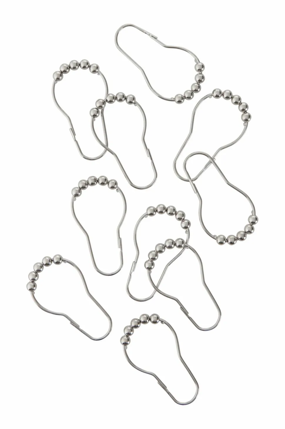 10 stk. ringe til badeforhæng. Ringene kan åbnes. Af sølvfarvet metal.