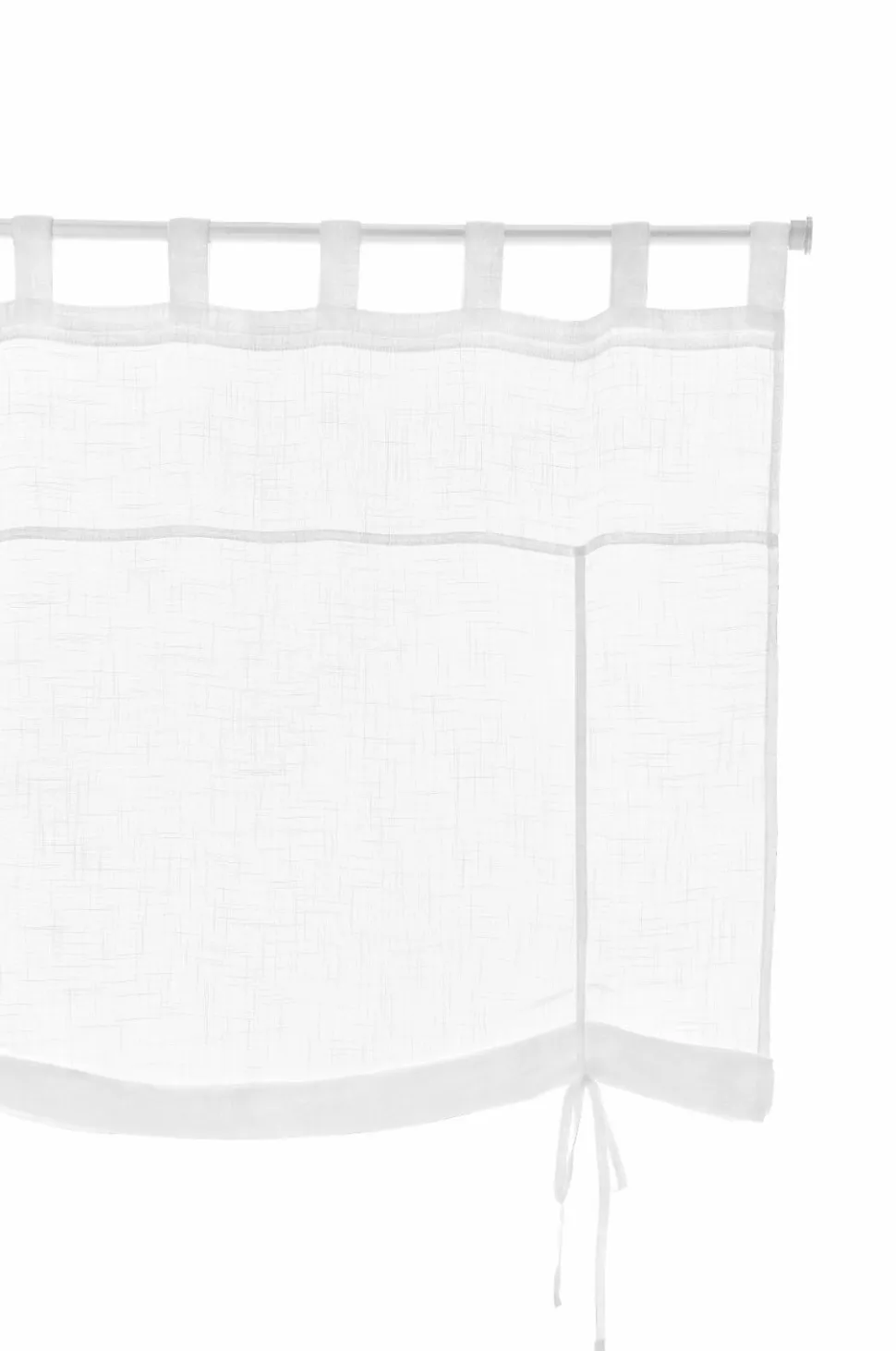 Roll up-gardin af luftig polyester med struktur i hørlook. Gardinet rulles op og fastgøres med bindebånd. Med stropper som trædes på gardinstang. Anvend gerne en rundstok forneden (medfølger ikke).
