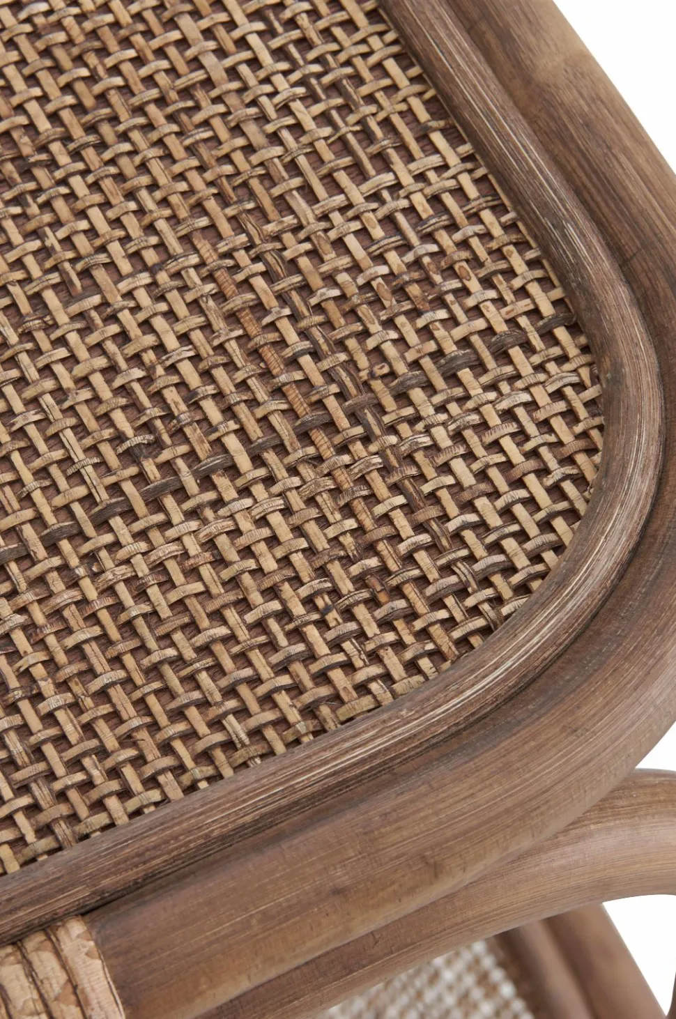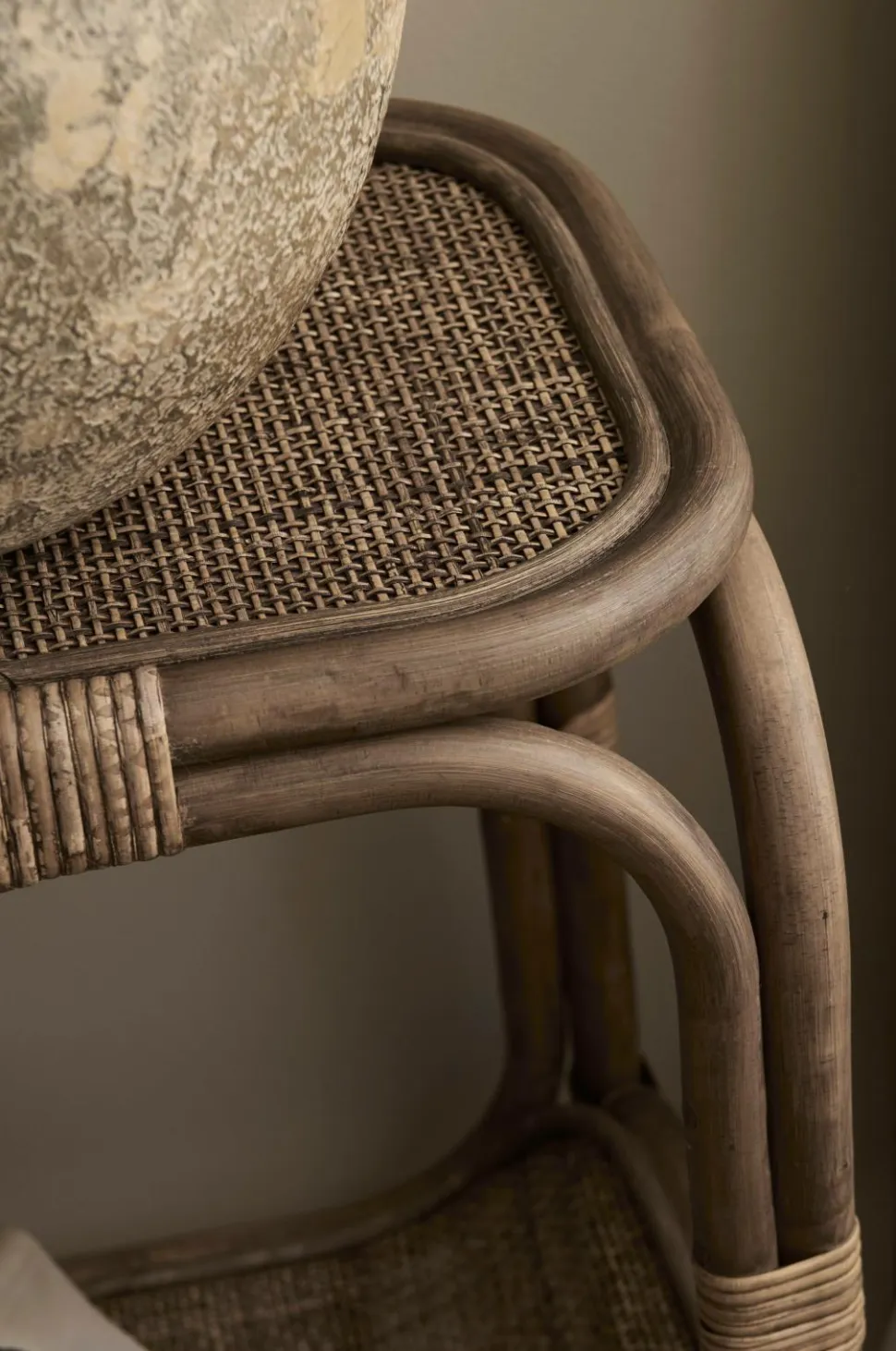Sengebord i rotting med hylde forneden. Toppen er forstærket med en plywoodplade under rottingen. Mål: Bredde 41 cm, højde 71 cm, dybde 31 cm. Benhøjde 22 cm. Højde til nederste hyldes overkant 25 cm. Mål mellem hylderne 42,5 cm.