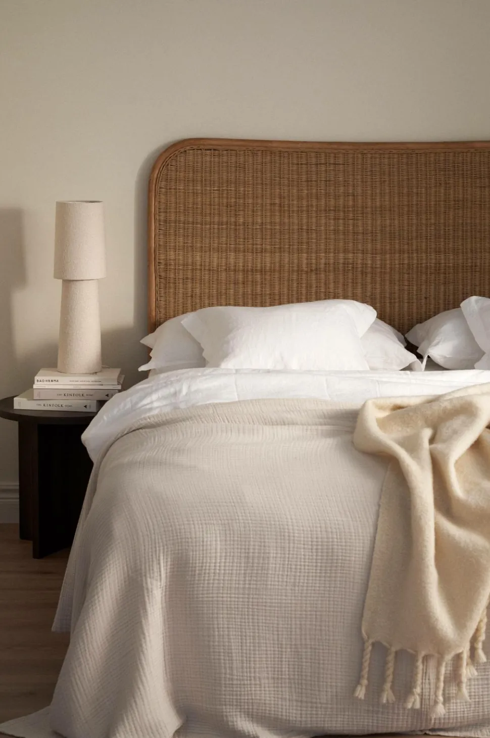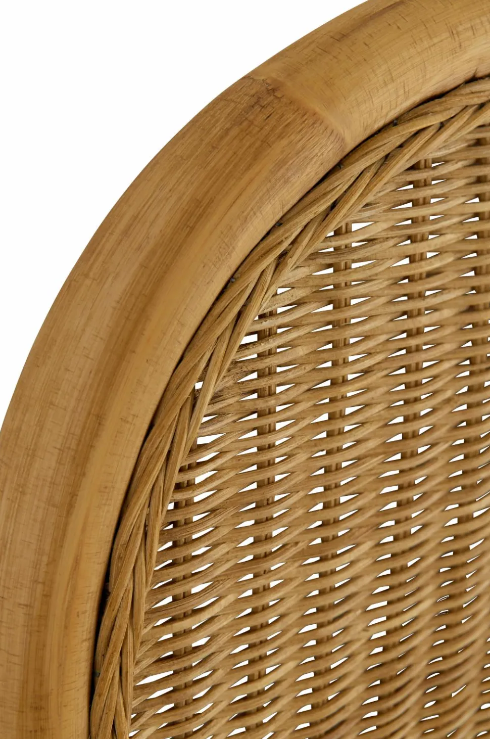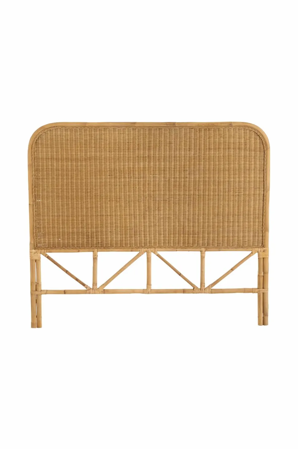 Hovedgavl i rotting med tætvævet top og dekorativ kant. Gavlen stilles på gulvet. Bredde 160 cm, højde 137 cm, dybde 4 cm. Benhøjde 24 cm.