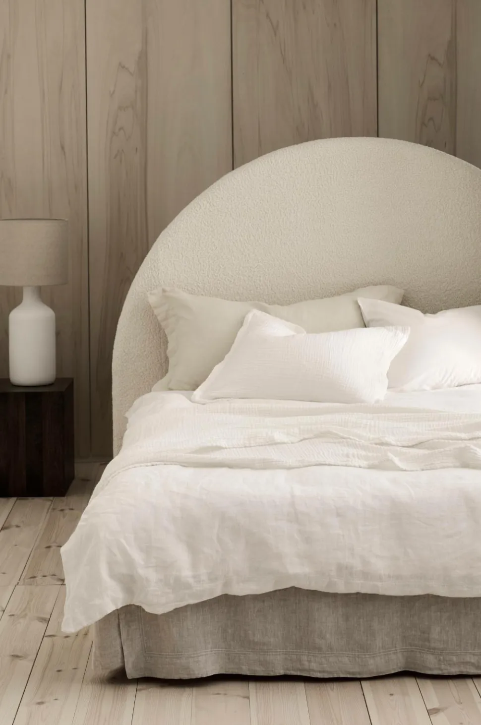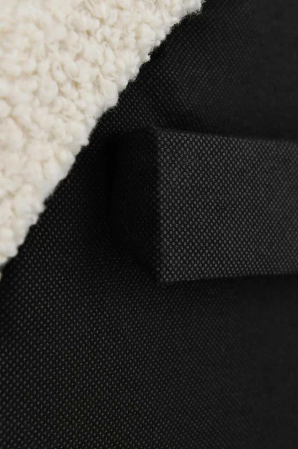 Sengegavl i buet form med betræk i imiteret fåreskind af 100% polyester. Stel i fyrretræ og plywood. Skumfyld. Sengegavlen stilles på gulvet. Leveres samlet.