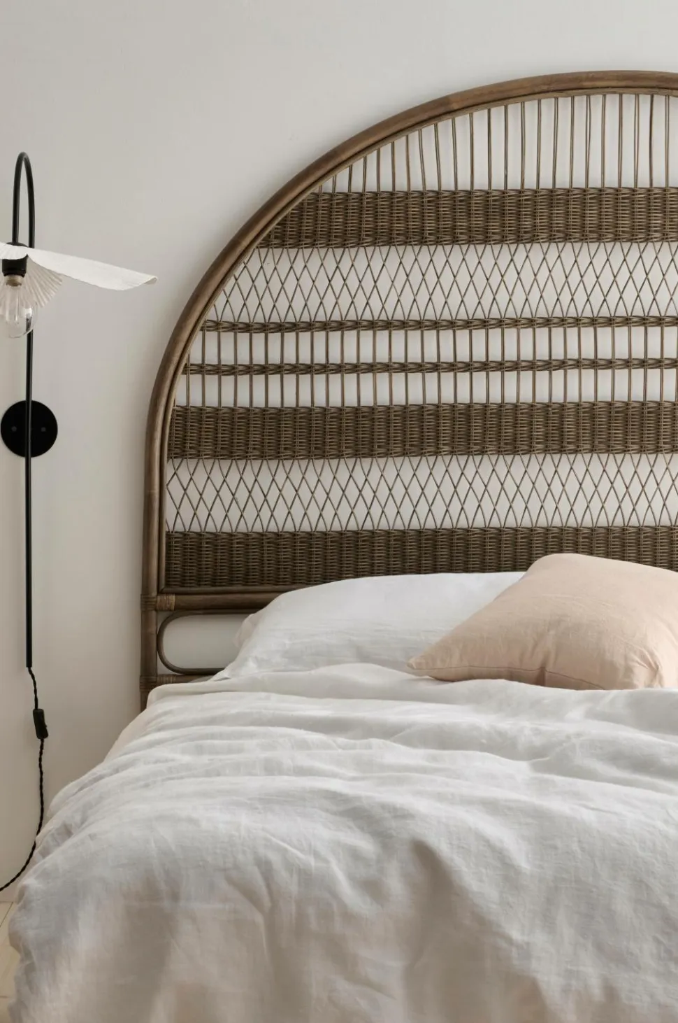 Hovedgavl i rotting med flettede striber. Gavlen stilles på gulvet. Frihøjde under møbel 39 cm. Leveres samlet.