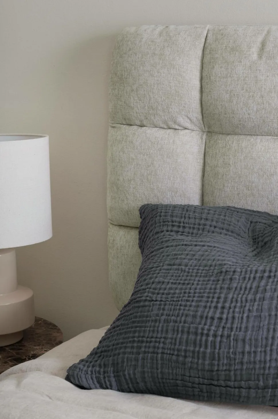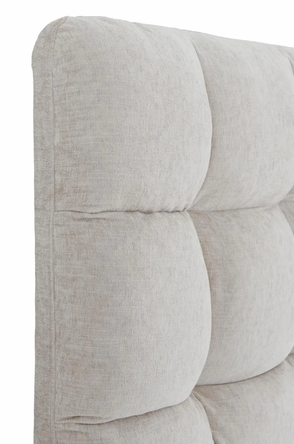 Vatteret sengegavl med ramme i massivt træ og plywood. Betræk i vasket velour af polyester med dekorative sømme som danner et ternet mønster. Fyld af polyestervat. Til vægophængning.