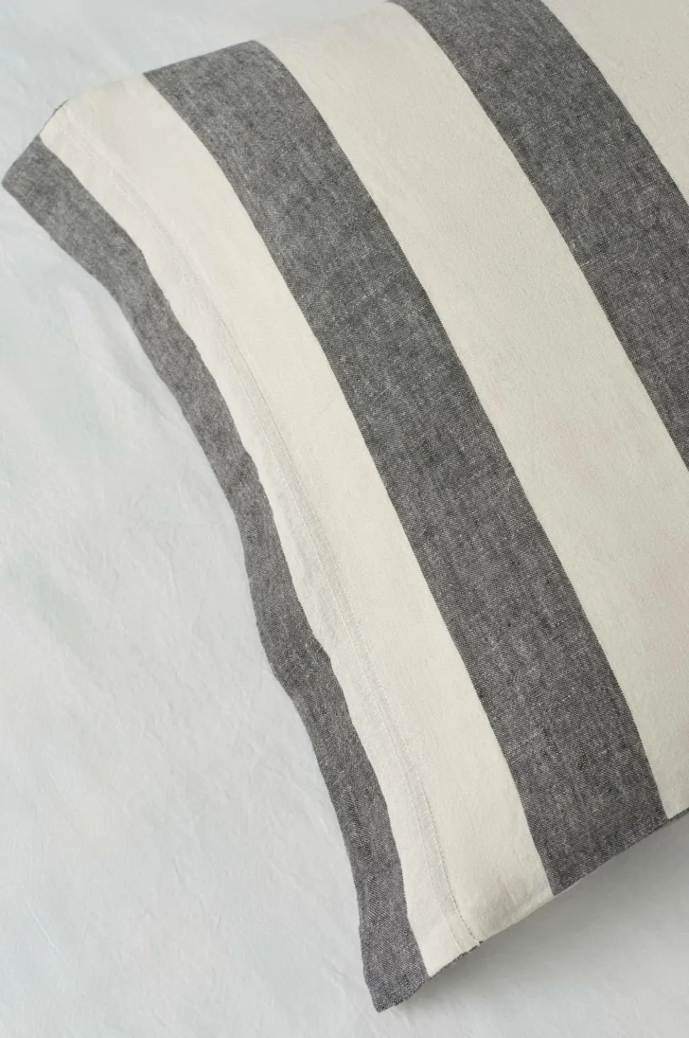 Sengesæt i vasket hørkvalitet af fransk hør med garnfarvede striber. Dynebetrækket har trykknapper i kanten forneden. Ingen huller til sengetøjsskift. Pudebetræk med 5 cm vinge på kortsiderne. Sættet indeholder 1 dynebetræk 150×200 cm (til enkeltdyne) og 1 pudebetræk 50×60 cm+vinge.