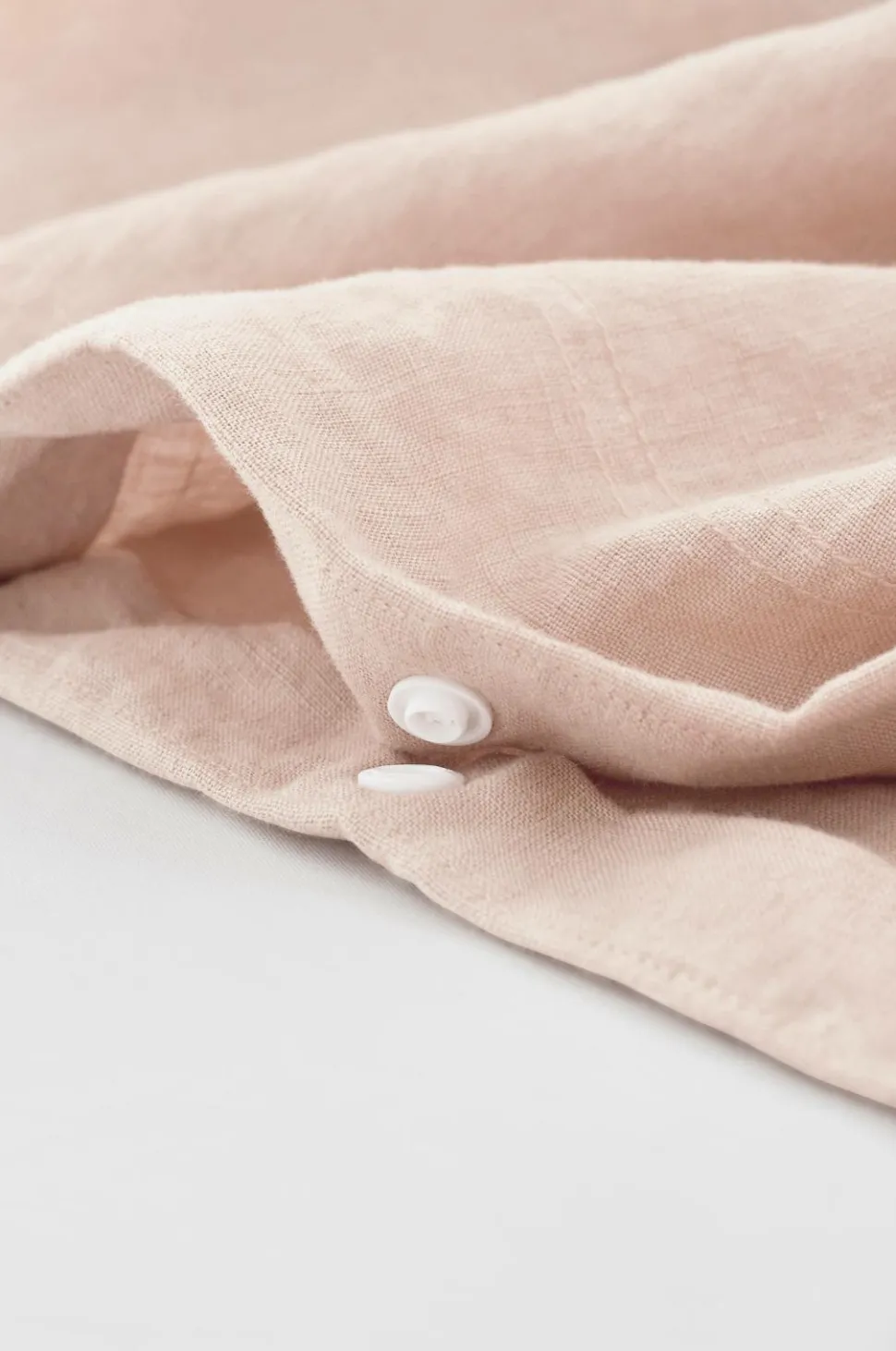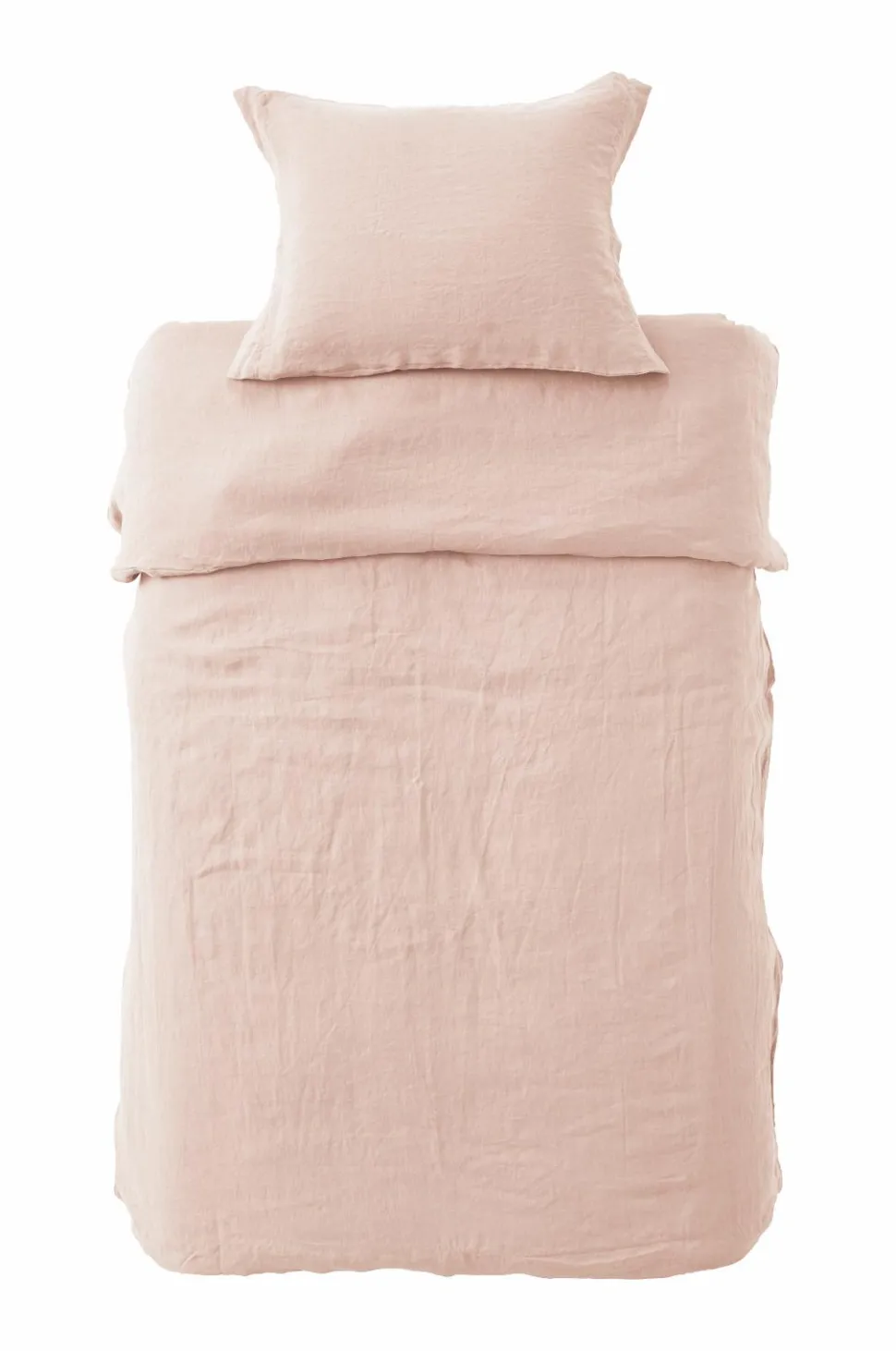 Sengesæt i herlig, vasket kvalitet af fransk hør. Trykknapper i kanten forneden på dynebetrækket. Uden huller i siden til brug ved opredning. Pudebetræk med 5 cm vinge på kortsiderne. Vægt 165 g/m2.