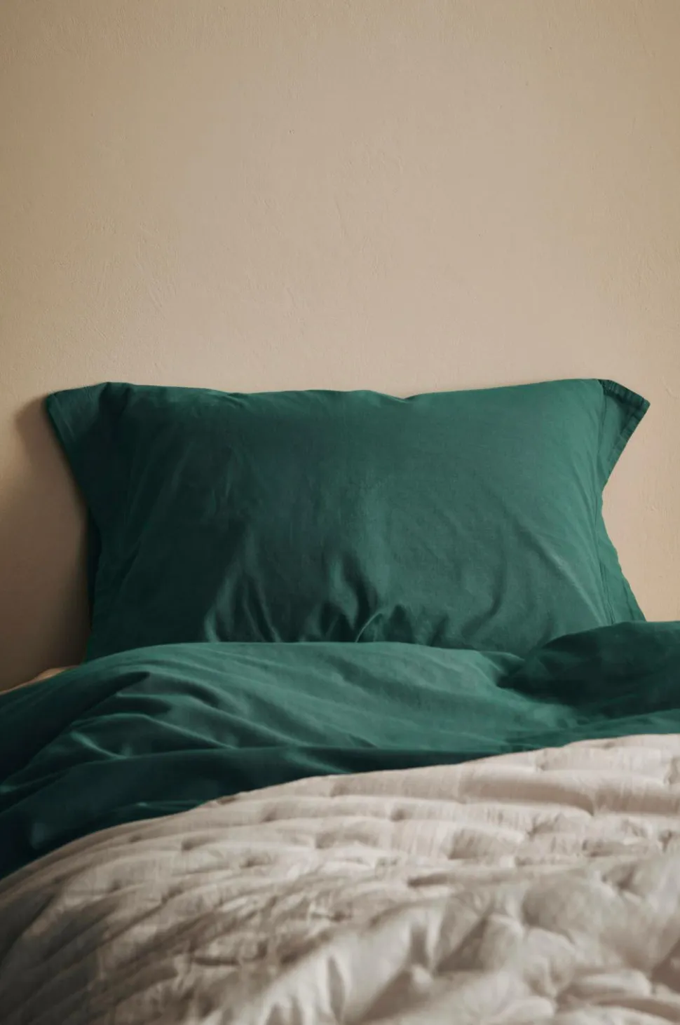 Sengesæt i skøn kvalitet af blødvasket bomuld. Trådtæthed 144 tc. Stykfarvet. Trykknapper i kanten forneden på dynebetrækket.