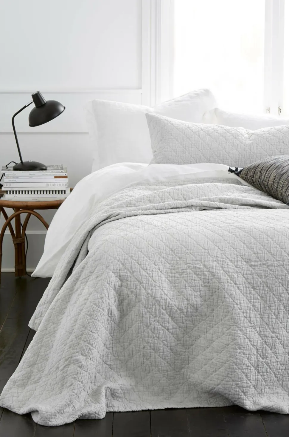 Sengetæppe i blødvasket bomuld med 5 cm søm rundt om.