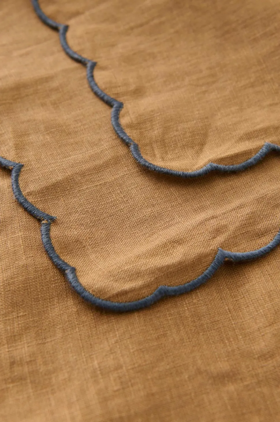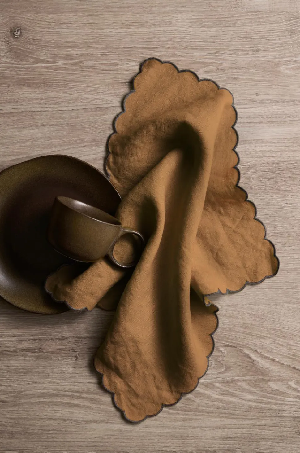 2 servietter i vasket hør med smuk struktur. Bølgekant med overlocksøm i kontrastfarve hele vejen rundt.