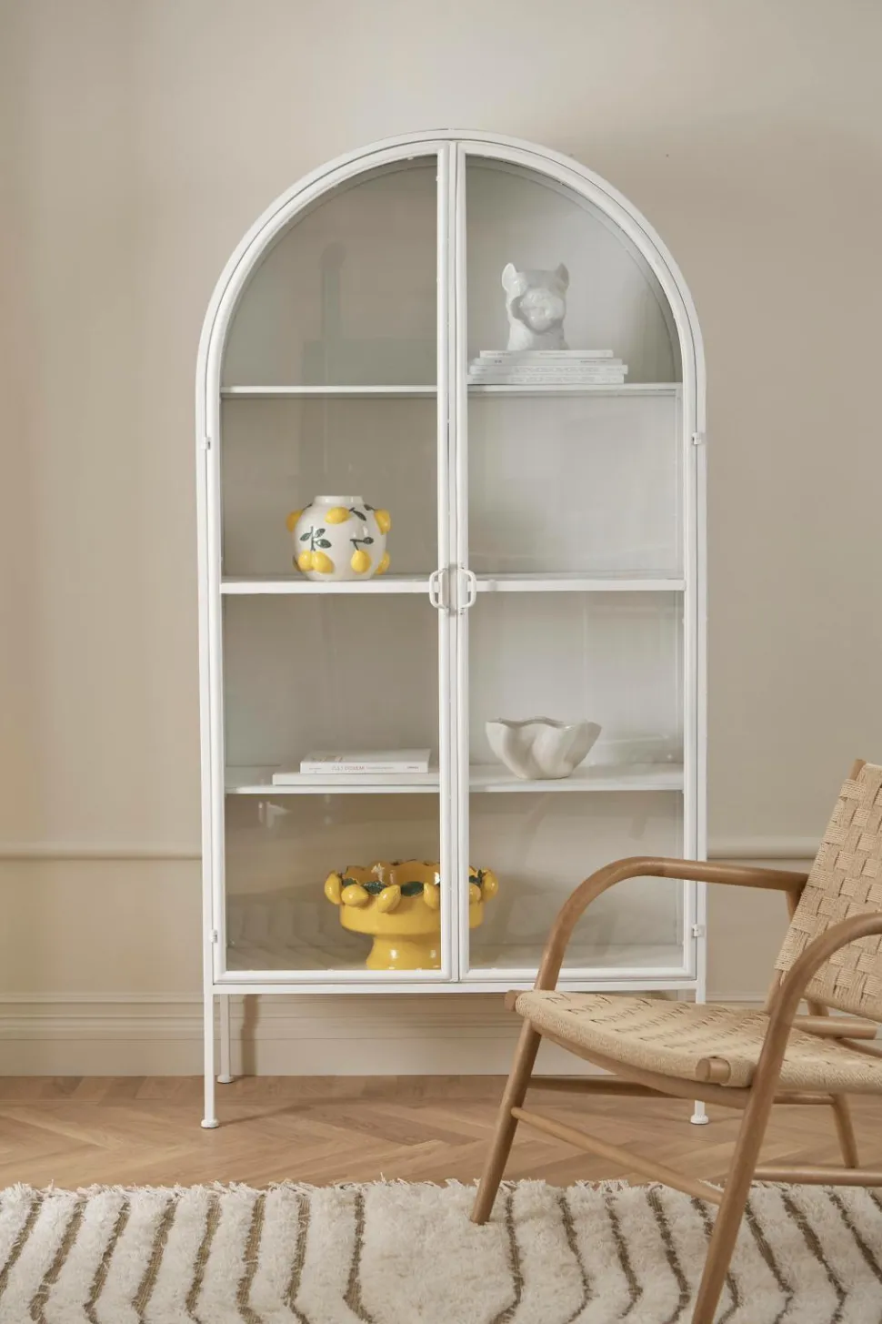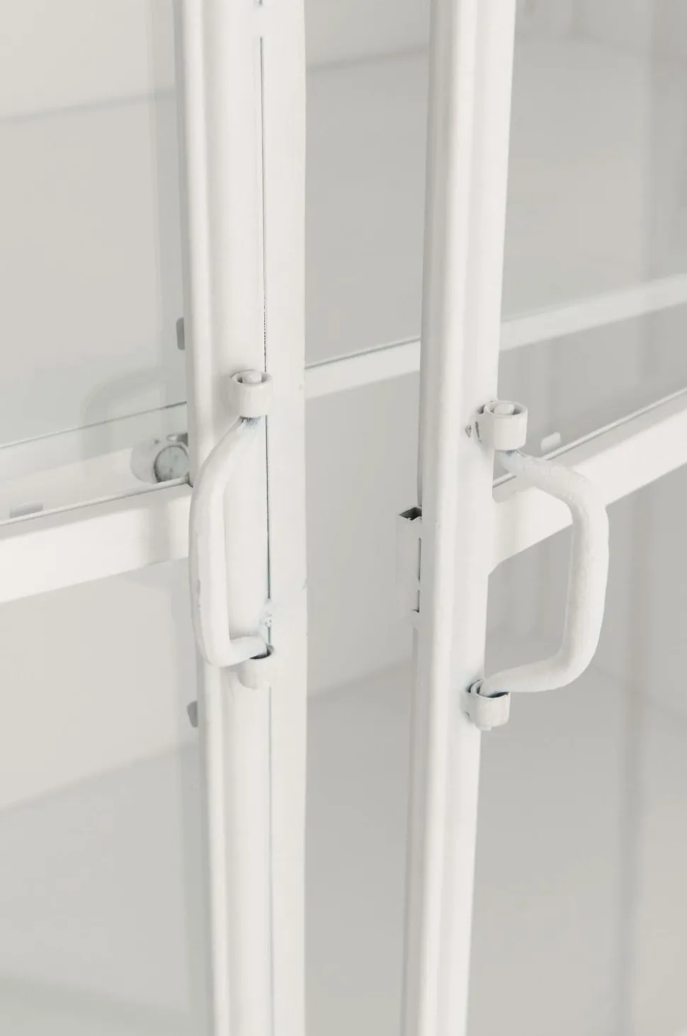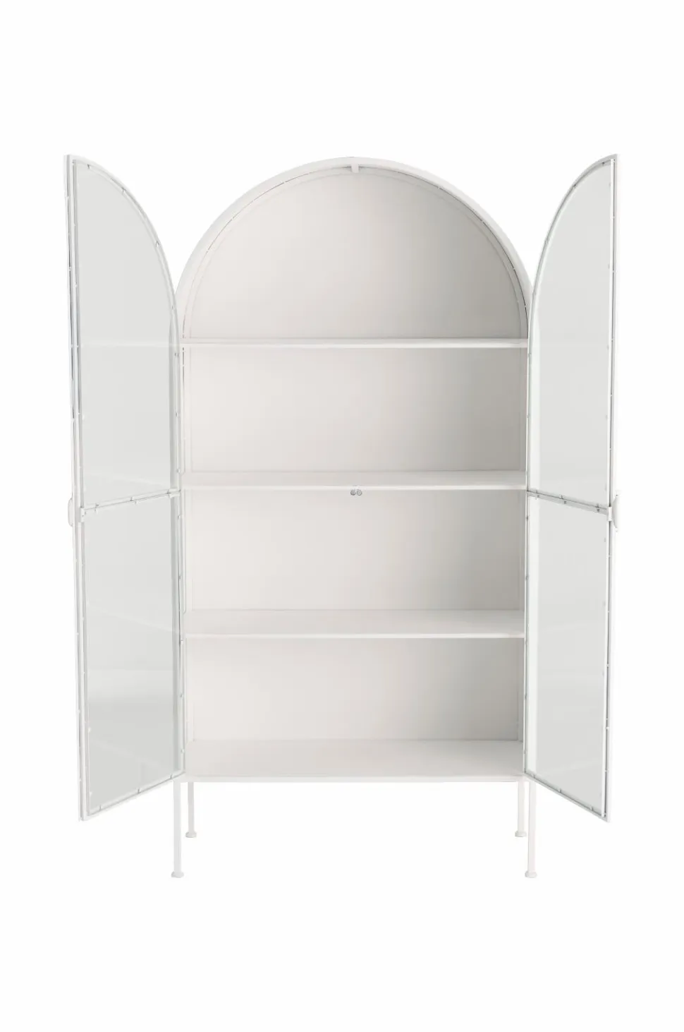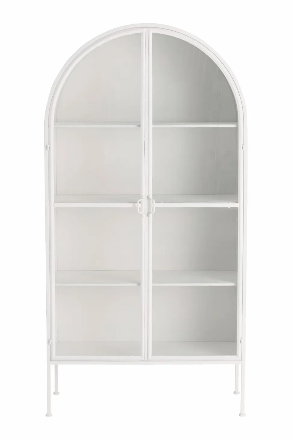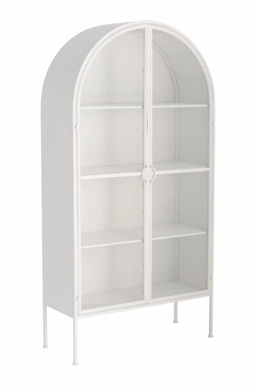 Hvælvet skab i metal. To låger med metalramme og hærdet, klart glas. Lågerne har magnetstop. 4 faste hylder i metal. Maks. vægt 10 kg/hylde. Hul på bagsiden til montering på væggen. Mål: Bredde 100 cm, højde 197 cm, dybde 40 cm. Benhøjde 26,5 cm. Hyldens indvendige mål 37 cm x 97 cm. Ca. 37 cm mellem hylderne. Leveres samlet.