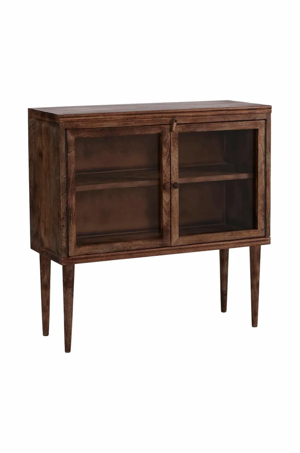 Letplaceret skænk af mangotræ. To vitrinedøre med glaslåger, træhåndtag og en dekorativ udvendig, drejelig dørstopper som holder døren lukket. Skabet har en fast hylde, højde på begge sider af hyldefladen 20 cm. Total mål: Højde 80 cm, bredde 80 cm, dybde 31 cm. Benhøjde 30 cm. Maks. belastning: 10 kg ovenfor og 10 kg på hver hylde (i alt 30 kg). Leveres monteret (benene skrues først på ved leveringen). Vægt 16 kg.