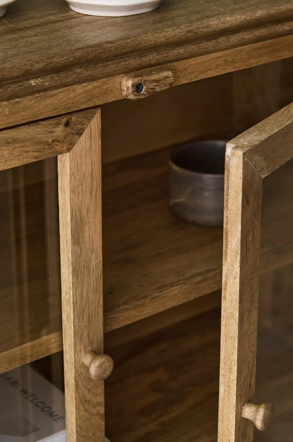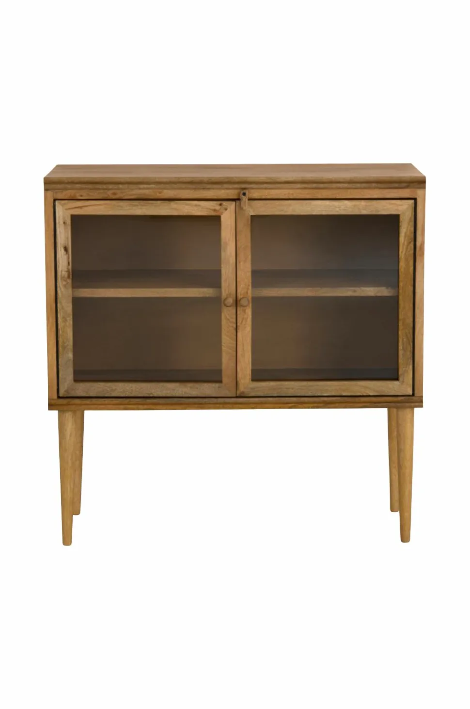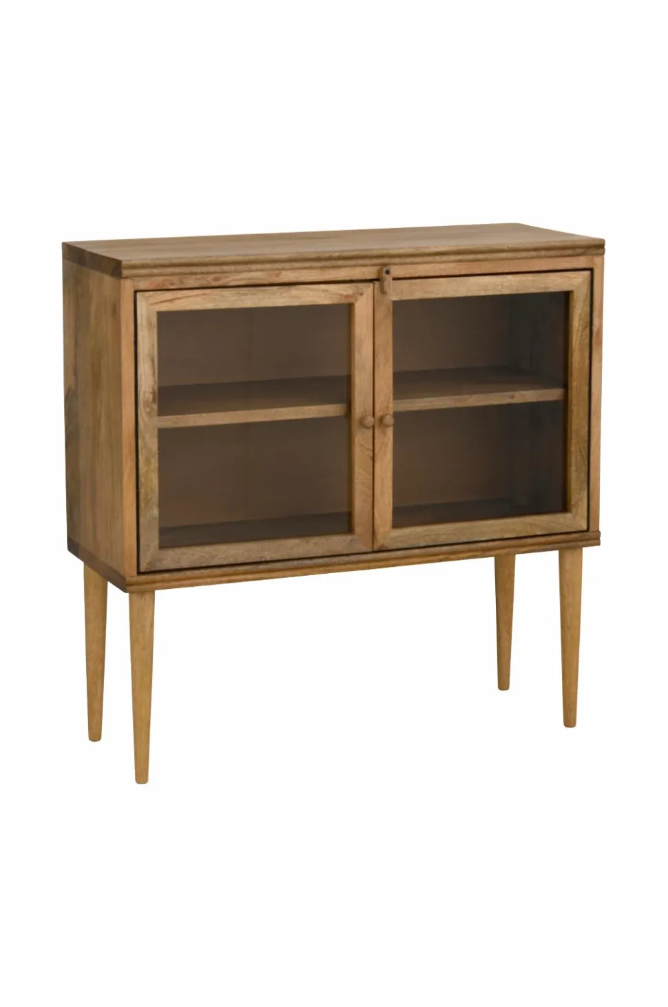 Letplaceret skænk af mangotræ. To vitrinedøre med glaslåger, træhåndtag og en dekorativ udvendig, drejelig dørstopper som holder døren lukket. Skabet har en fast hylde, højde på begge sider af hyldefladen 20 cm. Total mål: Højde 80 cm, bredde 80 cm, dybde 31 cm. Benhøjde 30 cm. Maks. belastning: 10 kg ovenfor og 10 kg på hver hylde (i alt 30 kg). Leveres monteret (benene skrues først på ved leveringen). Vægt 16 kg.