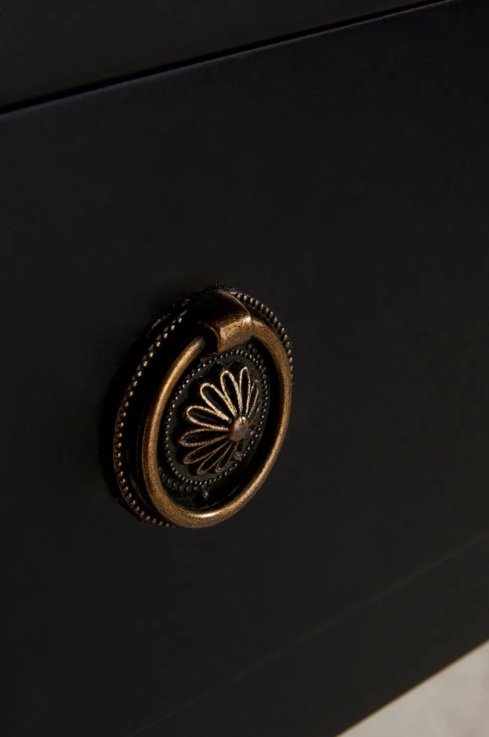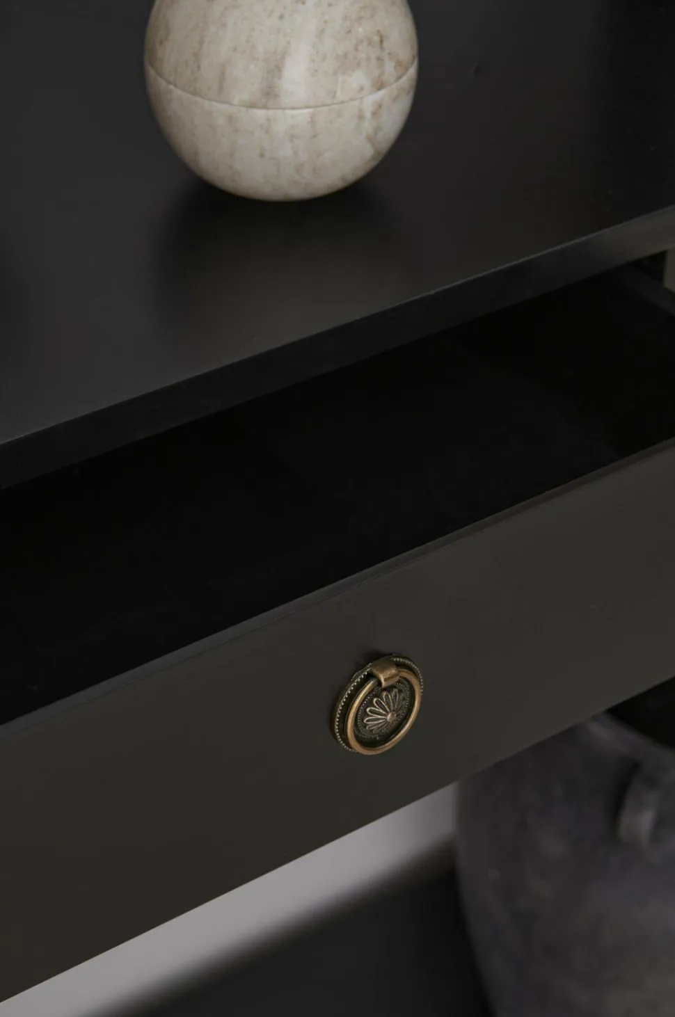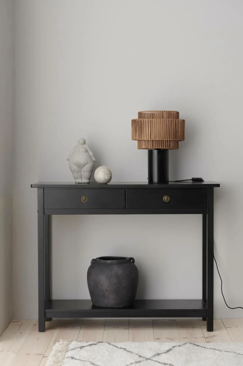 Skænk i massiv fyr og MDF. To små skuffer. Højde 82,5 cm, bredde 104 cm, dybde 37 cm. Højde fra gulv til hyldeflade 7 cm. Lev. usamlet.
