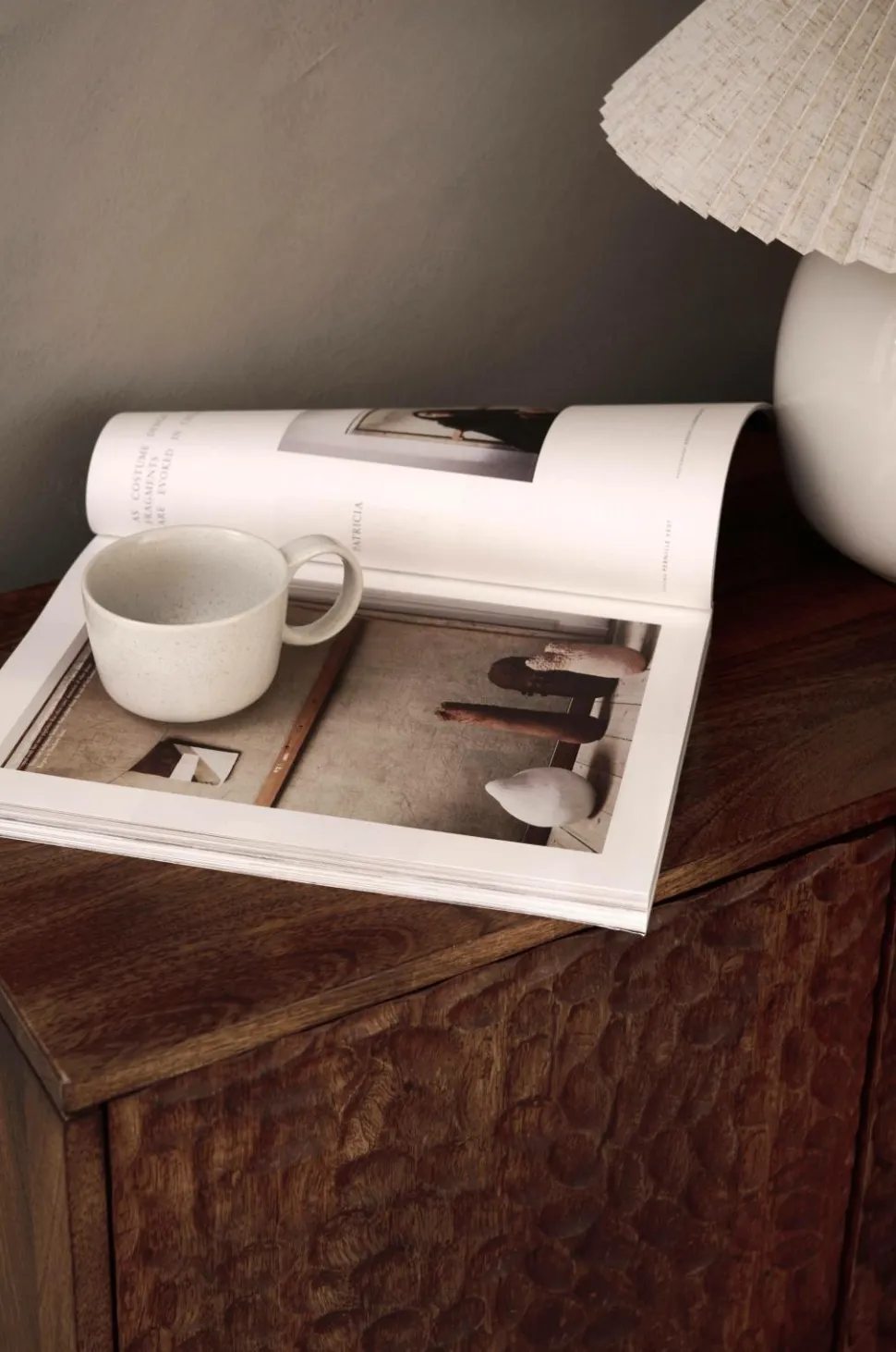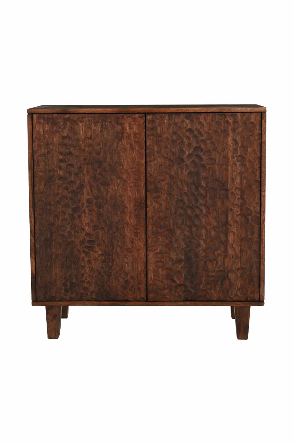 Skænk af massivt mangotræ med vokset finish. 2 skabe med låger som har et smukt udskåret mønster. Lågerne har push-funktion. 1 fast hylde i hvert skab. Højde mellem hylder 31 cm. Frihøjde under møbel 13 cm. Lettere montering (kun benene skrues på).