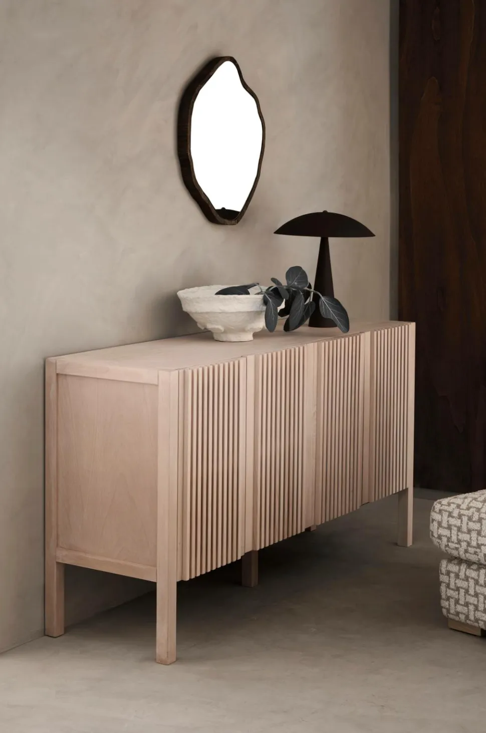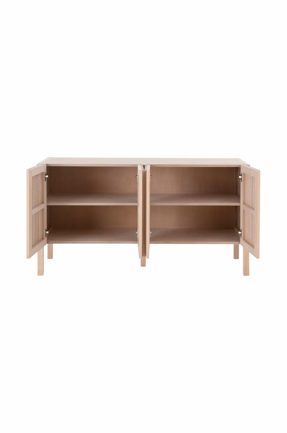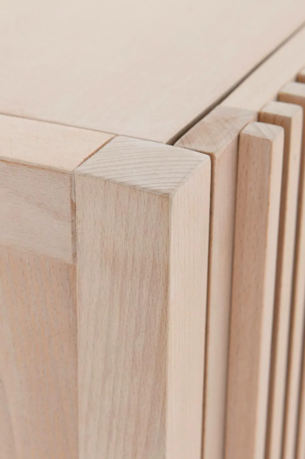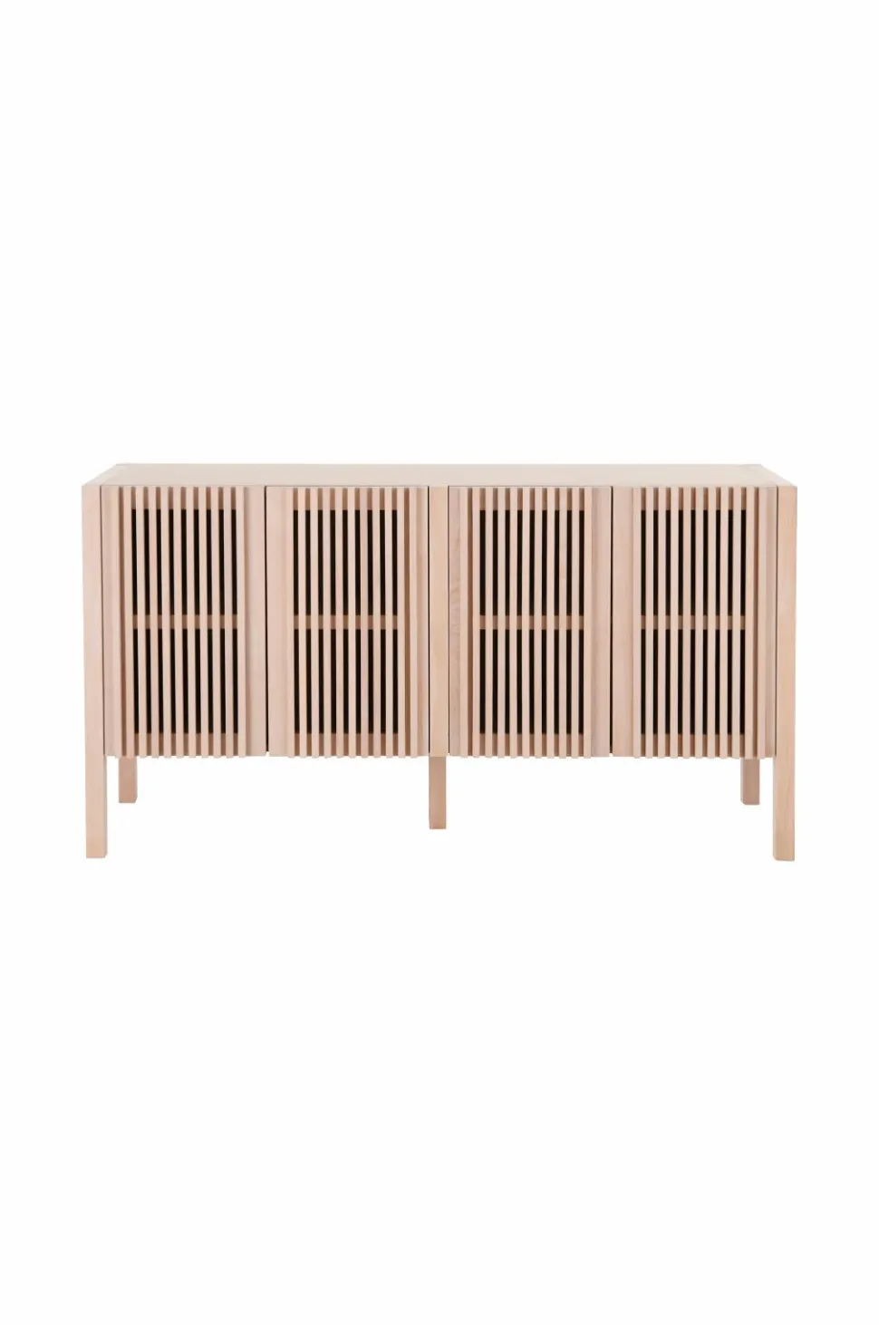 Hvidlaseret skab i bøg med lamelstruktur i lågerne. To skabe med dobbeltlåger. 2 fasta hylder i skabet. Højde mellem hylderne 26 cm. Frihøjde under møbel 22 cm. Leveres samlet.