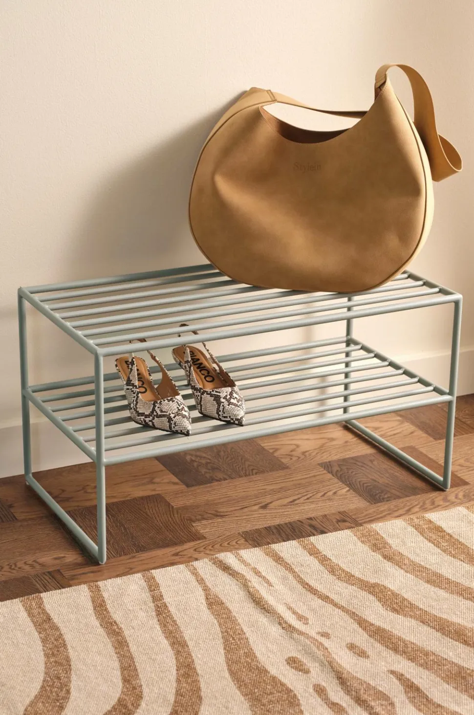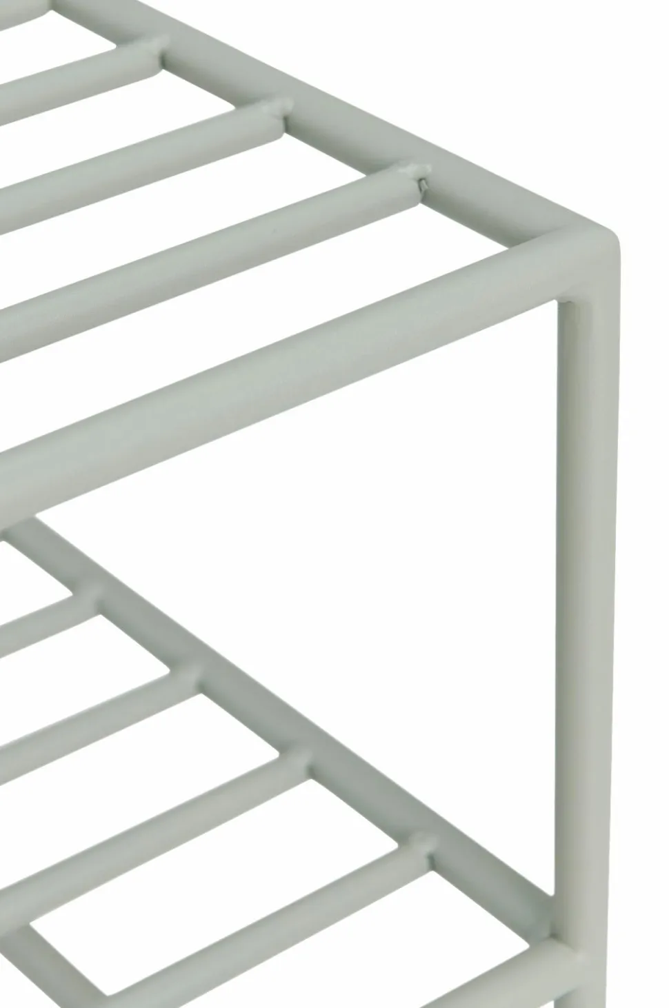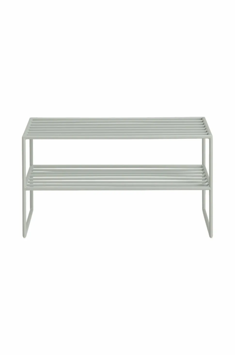 Skoreol i pulverlakeret metal med 2 hylder. Højde mellem hylderne 15 cm. Frihøjde under hylden 17 cm.