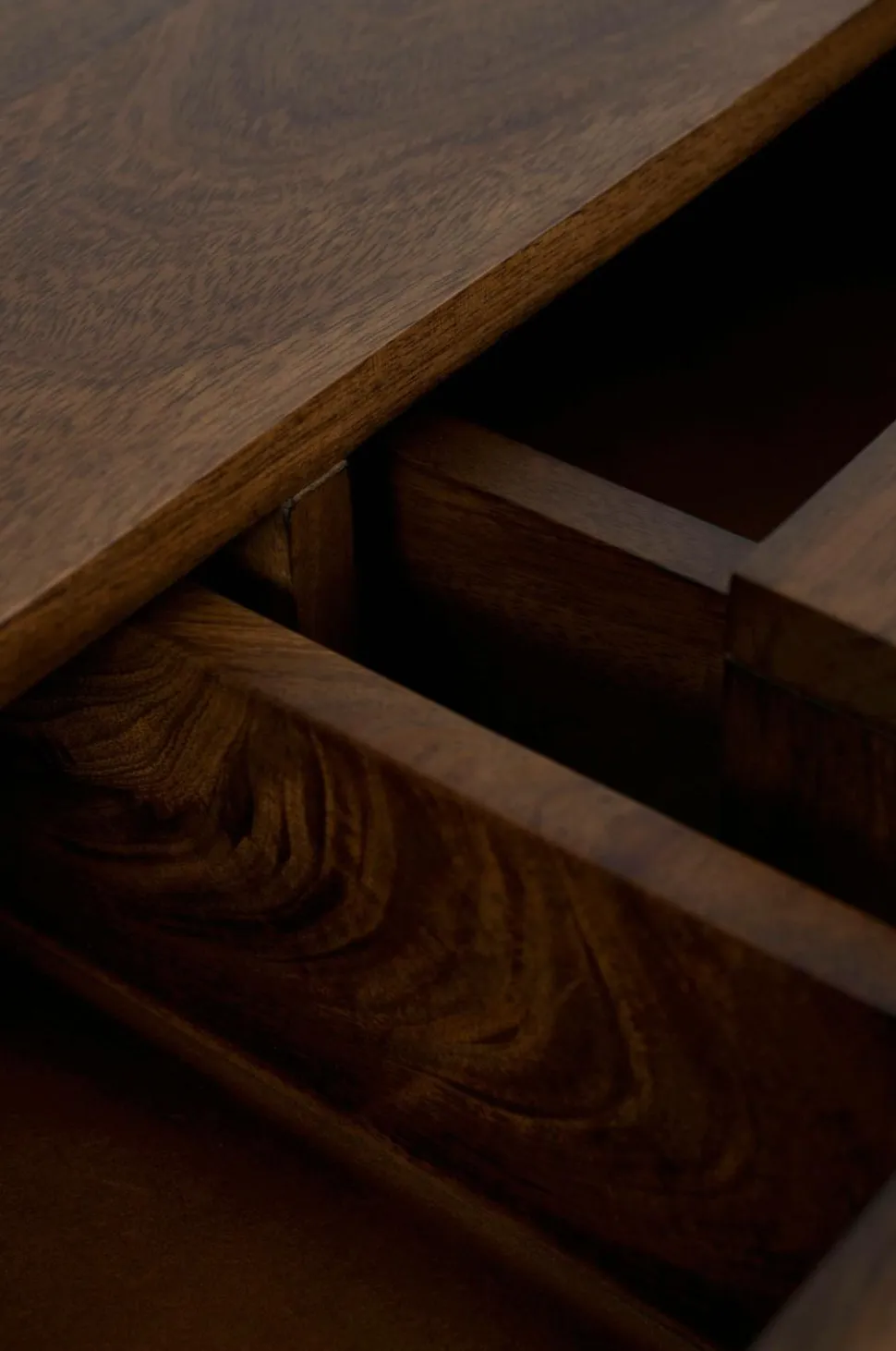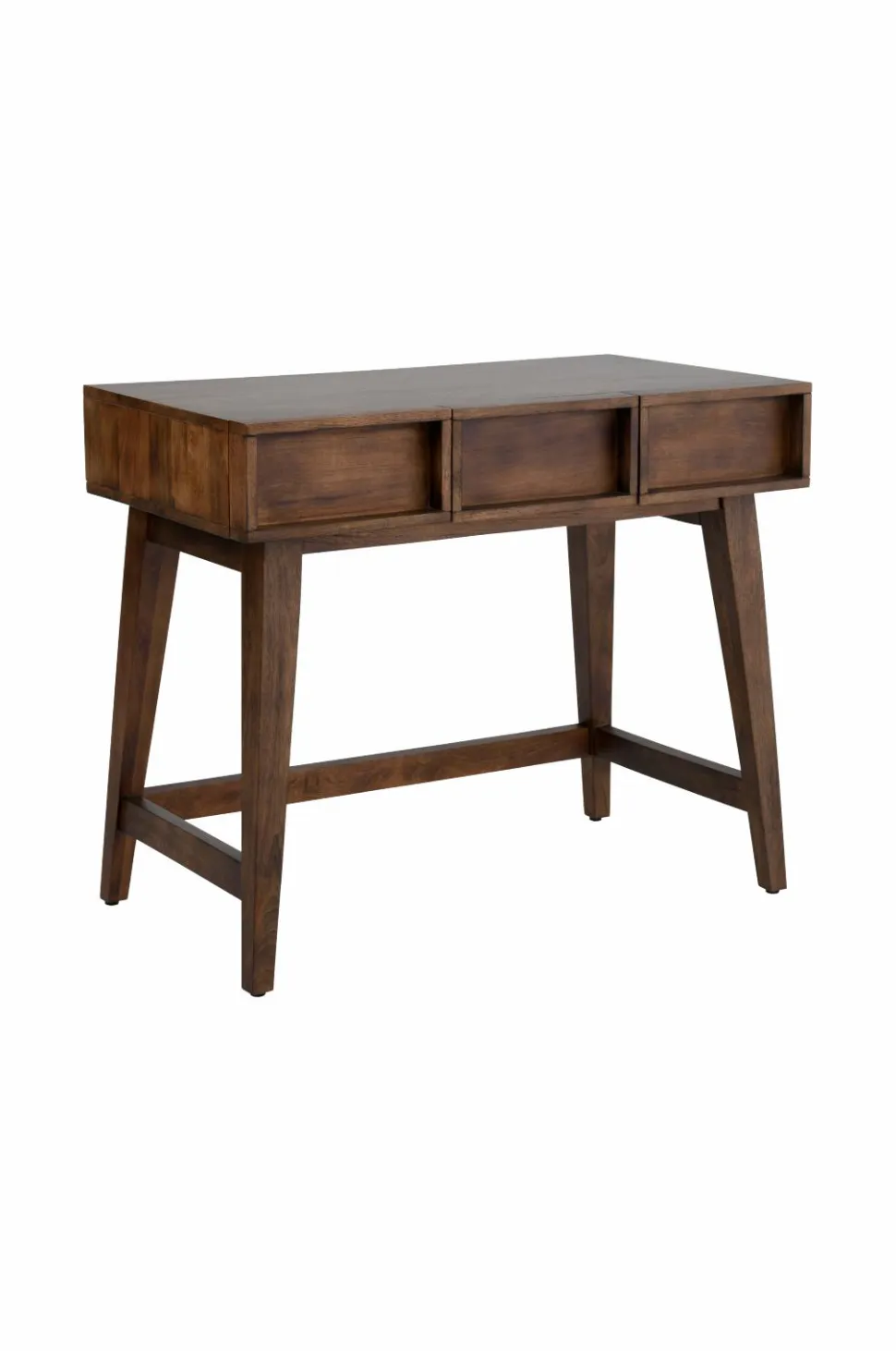 Skrivebord af mangotræ med vokset overflade. Tre skuffer med skuffestop. Frihøjde under møbel 57 cm. Lettere samling. Produktet indeholder FSC-certificeret træ, som er fældet i et ansvarsfuldt skovbrug, der tager hensyn til mennesker og miljø.