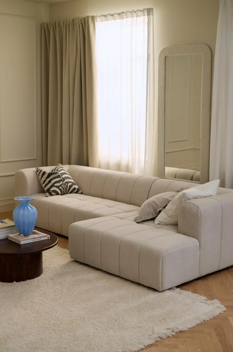 2-delt sofa med bred, højrevendt chaiselong. Delene kan placeres hver for sig.