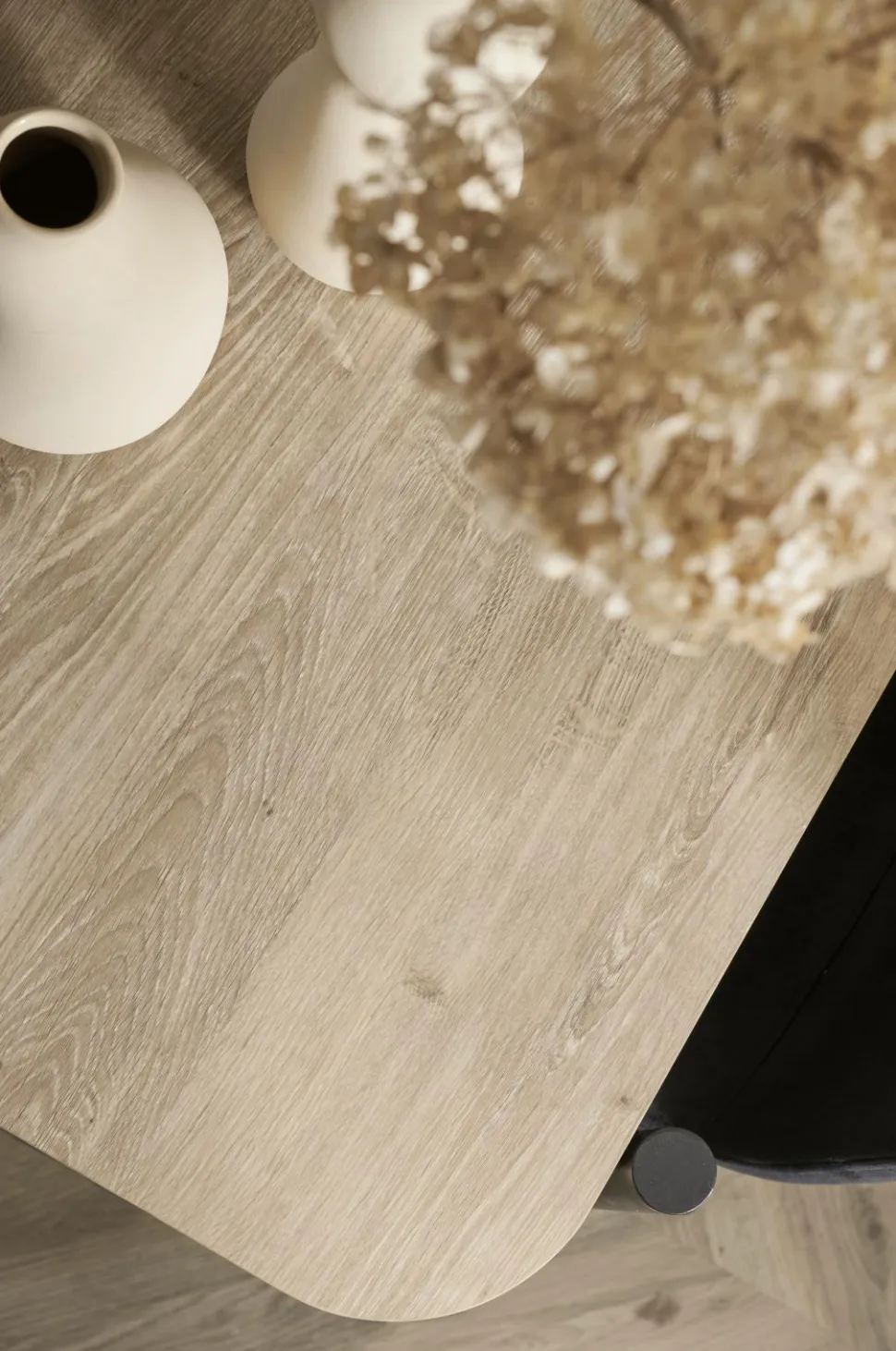 Spisegruppe med bord og otte stole. Bordet har pulverlakerede metalben og en plade i folieret MDF.