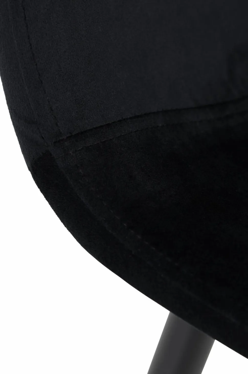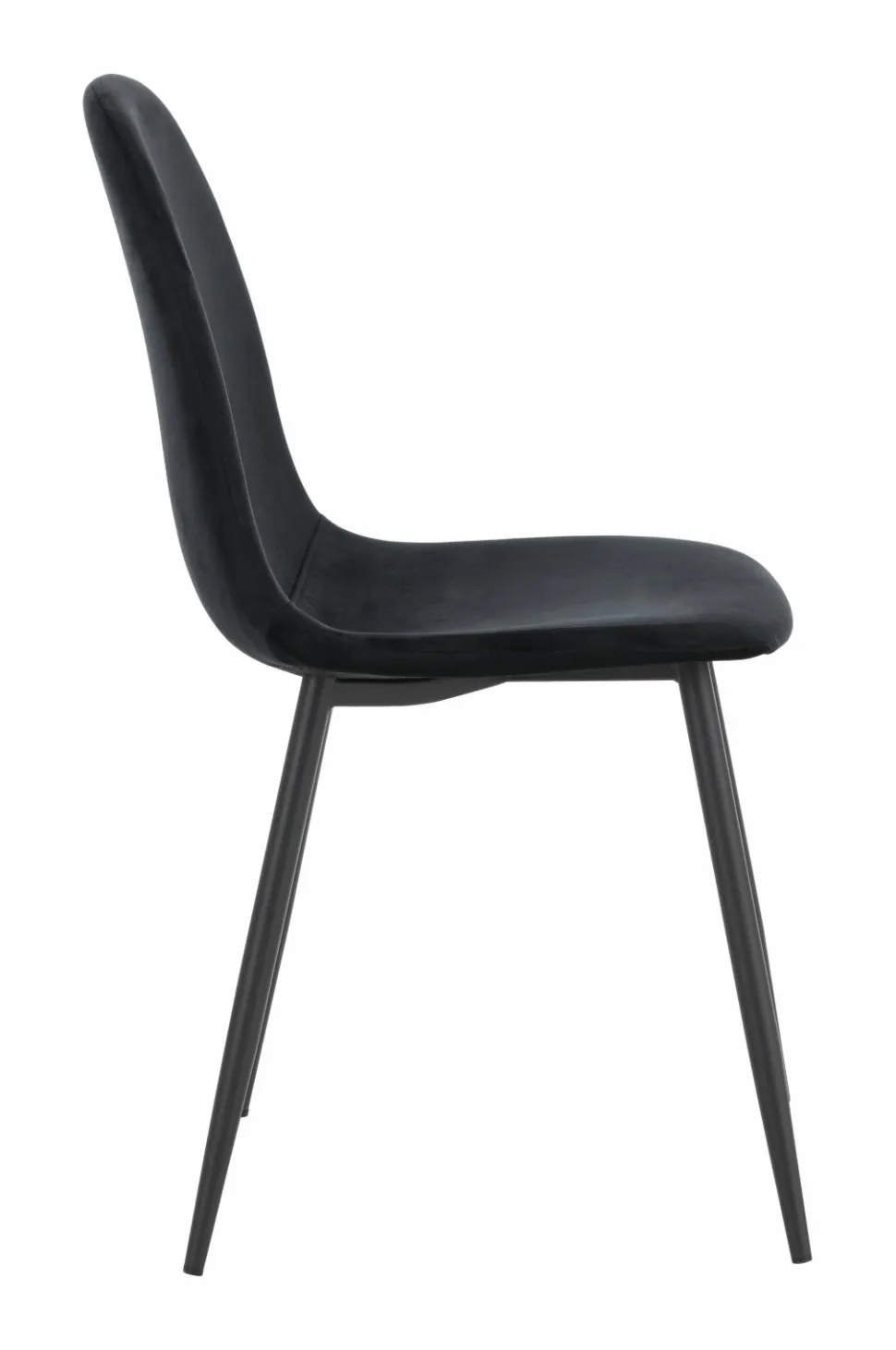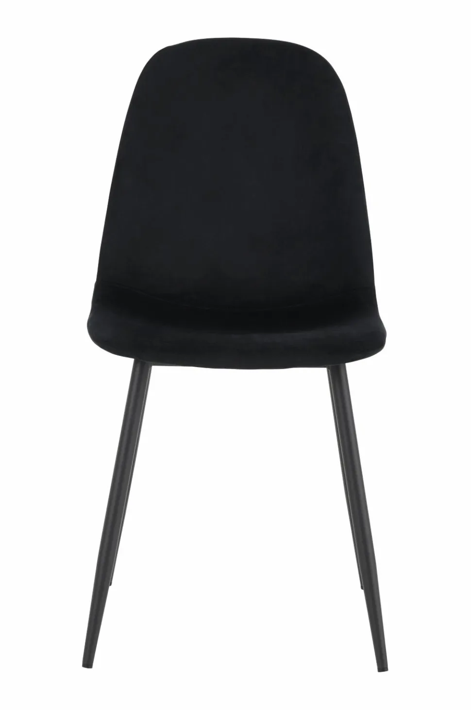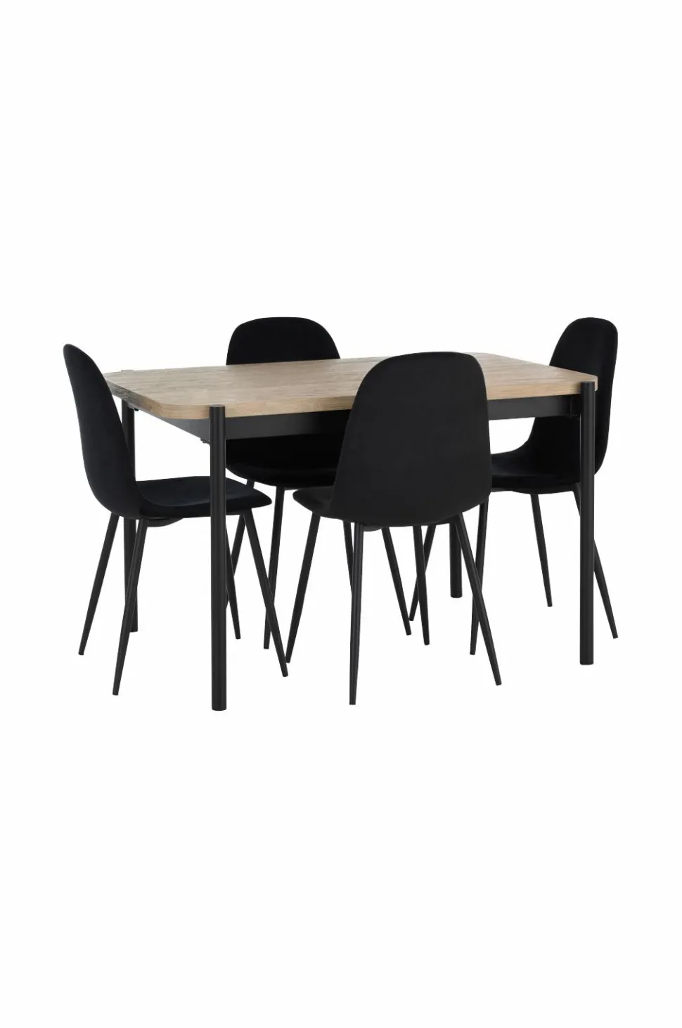 Spisegruppe med et bord og fire stole. Bordet har pulverlakerede metalben og en plade i folieret MDF. Stole med pulverlakerede metalben. Sæde med fløjlspolstring og skumfyld.