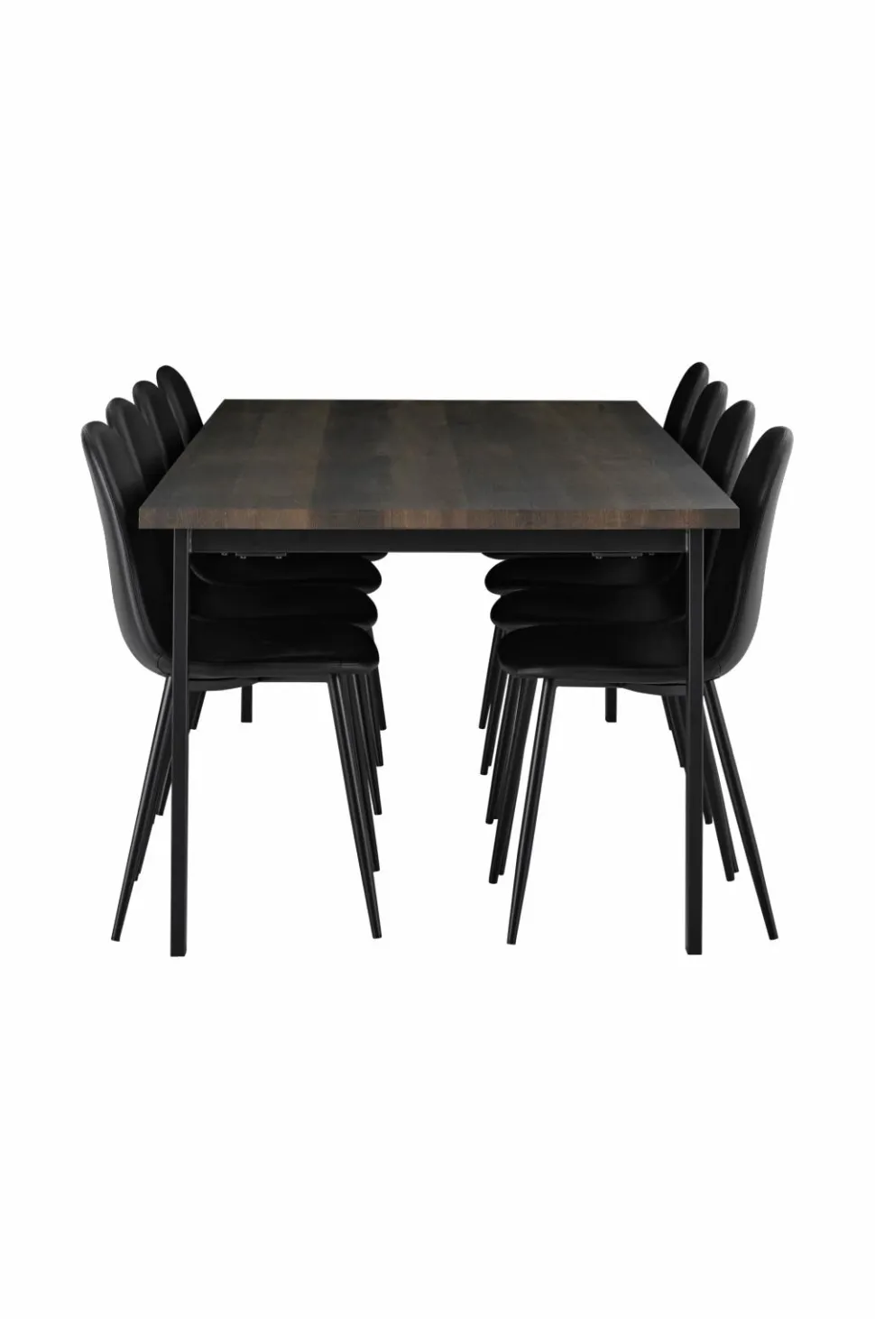 Spisegruppe med et bord og otte stole. Bordet har pulverlakerede metalben og en bordplade i folieret MDF.