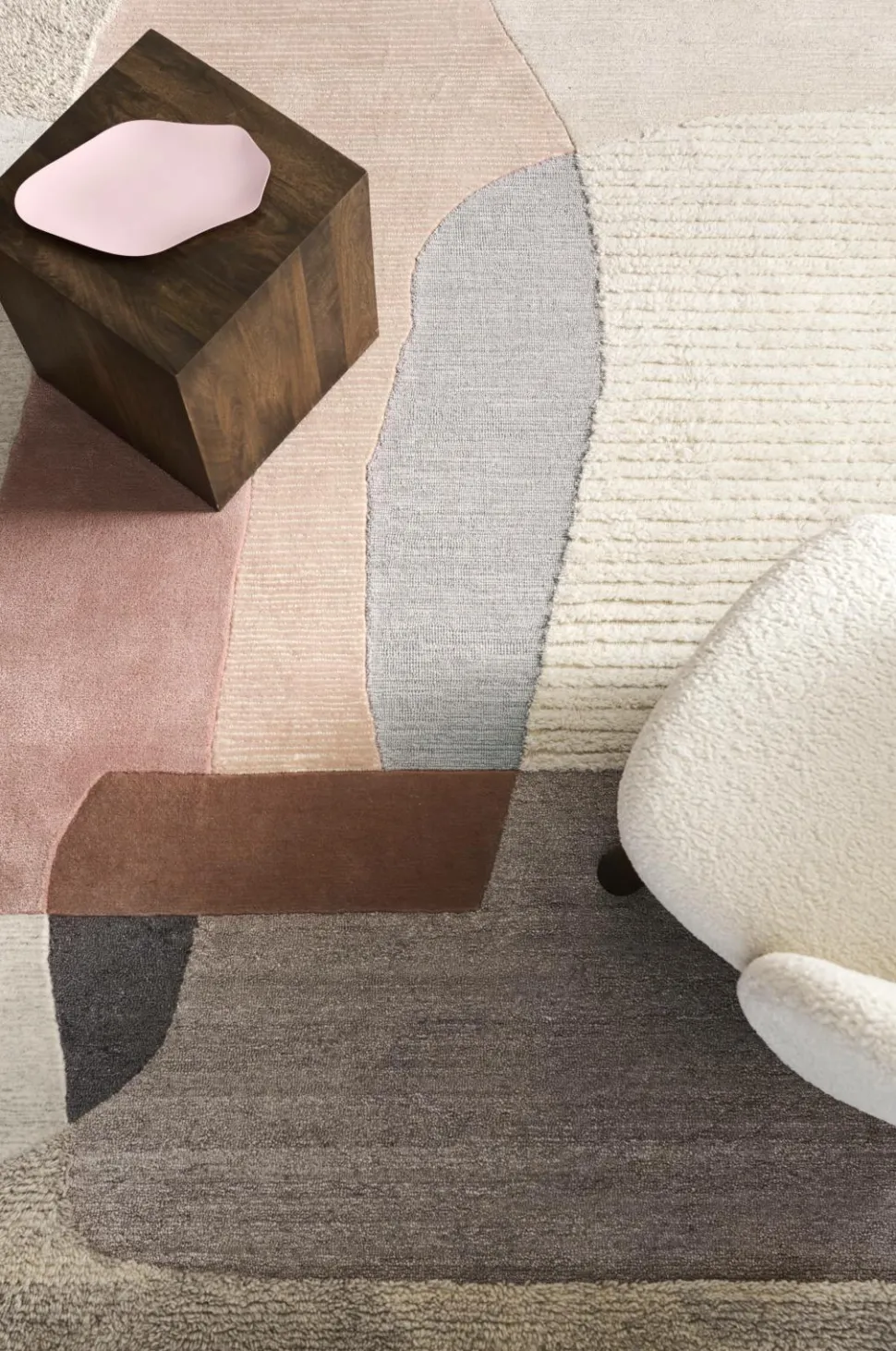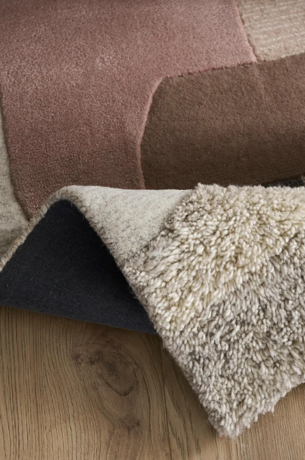 Håndvævet og håndknyttet uldtæppe med forskellige strukturer som skaber en patchwork-effekt. Bagside i bomuld. Tæppets tykkelse 1,5 cm.