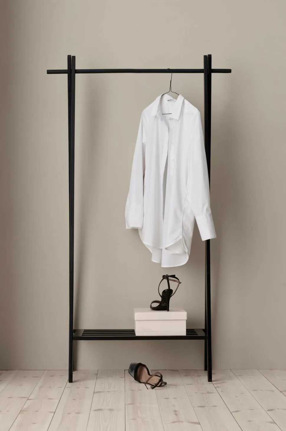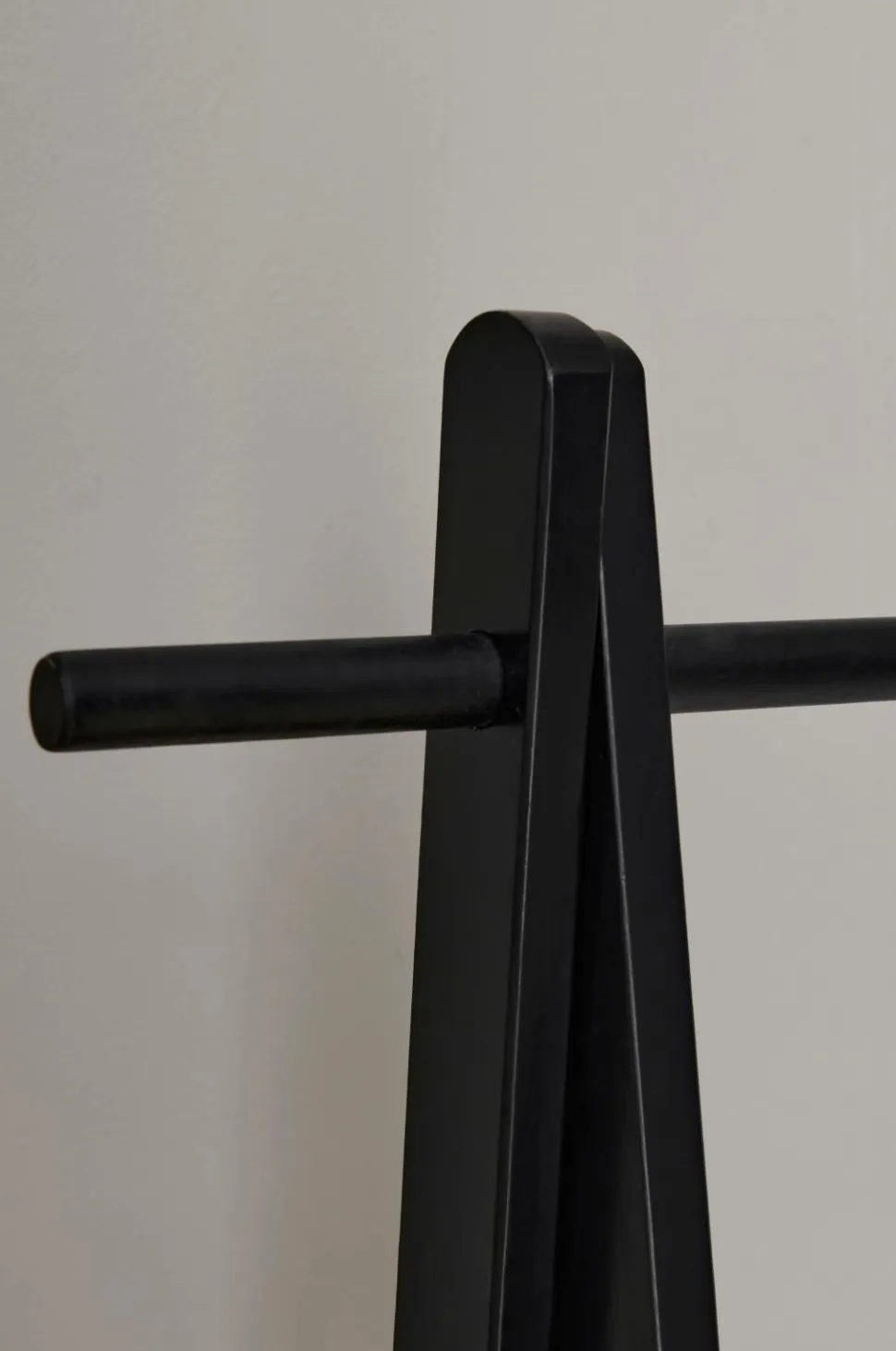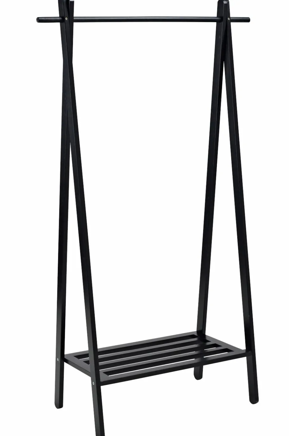 Tøjstativ af olieret (natur) eller spraymalet (hvid) massiv eg. Højde 159 cm. Bredde 91 cm. Dybde 43 cm. Lev. usamlet. Vægt ca. 6 kg.