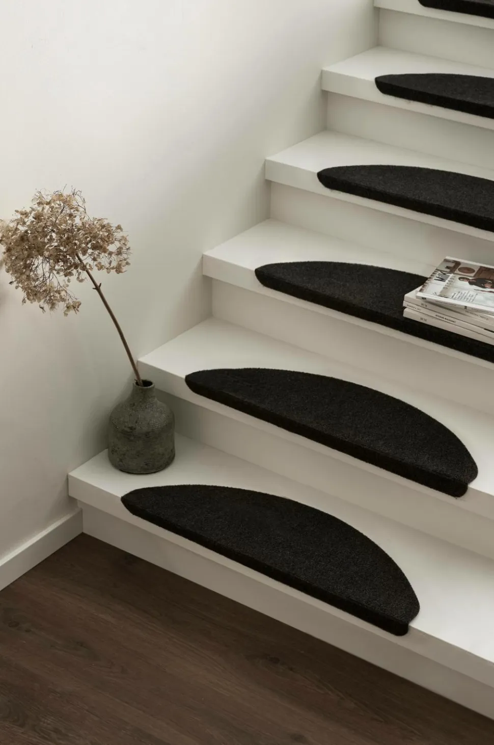 Ensfarvet med selvklæbende bagside. Af polypropylen. Støvsugning/skumvask. Str. 64×21 cm + 3 cm kant til at folde ned.