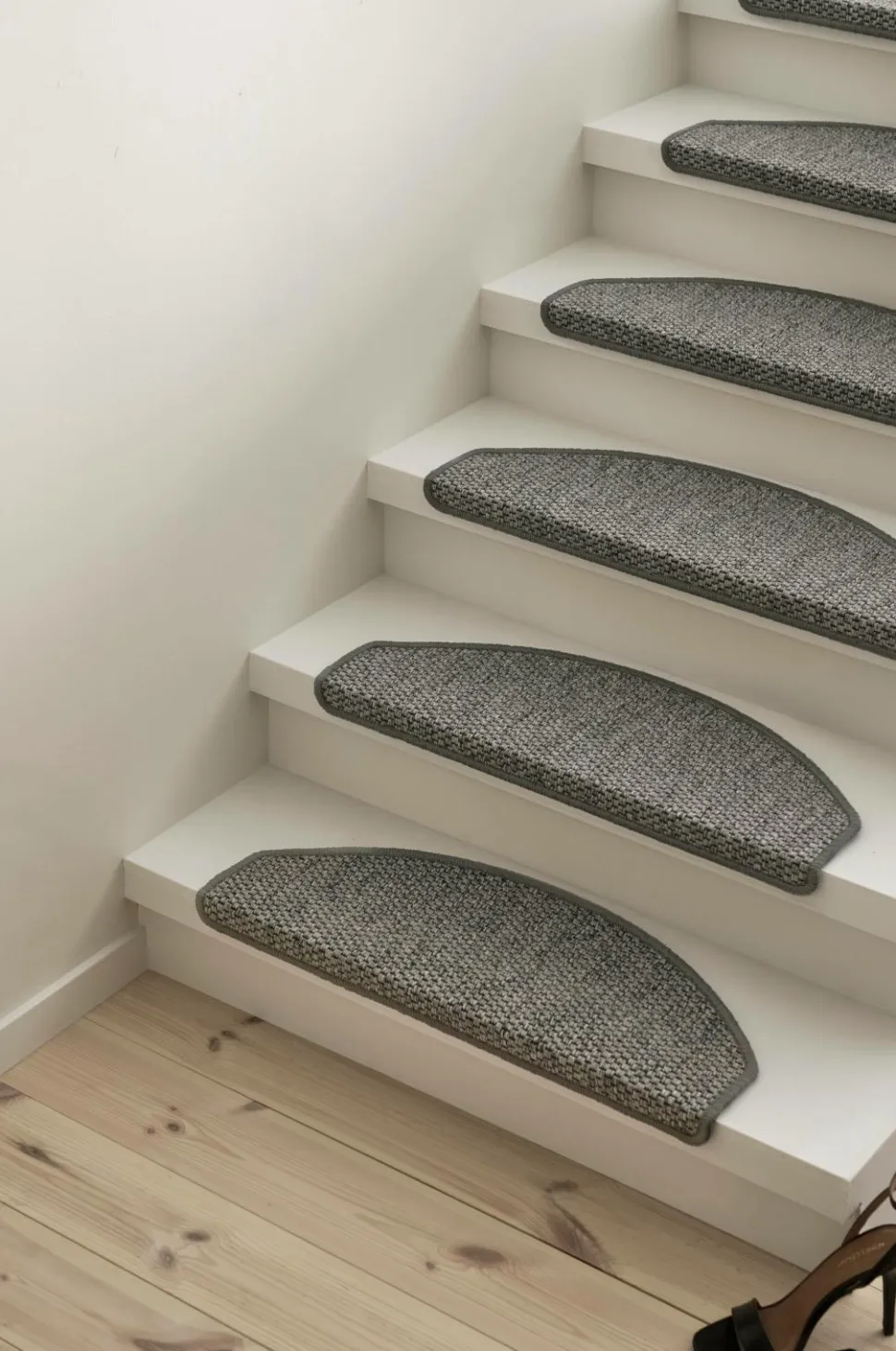 Trappetrinsmåtte i 12-pak. Vævet i sisallignende struktur med riede kanter. Bagside af hård plastprofil og dobbeltklæbende tape.