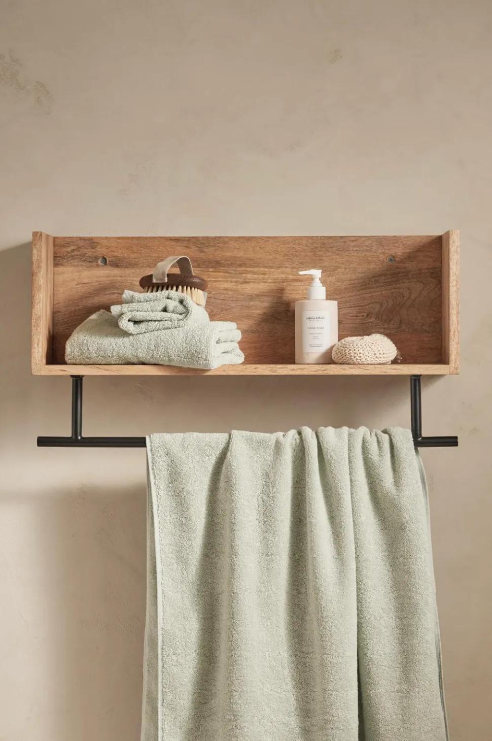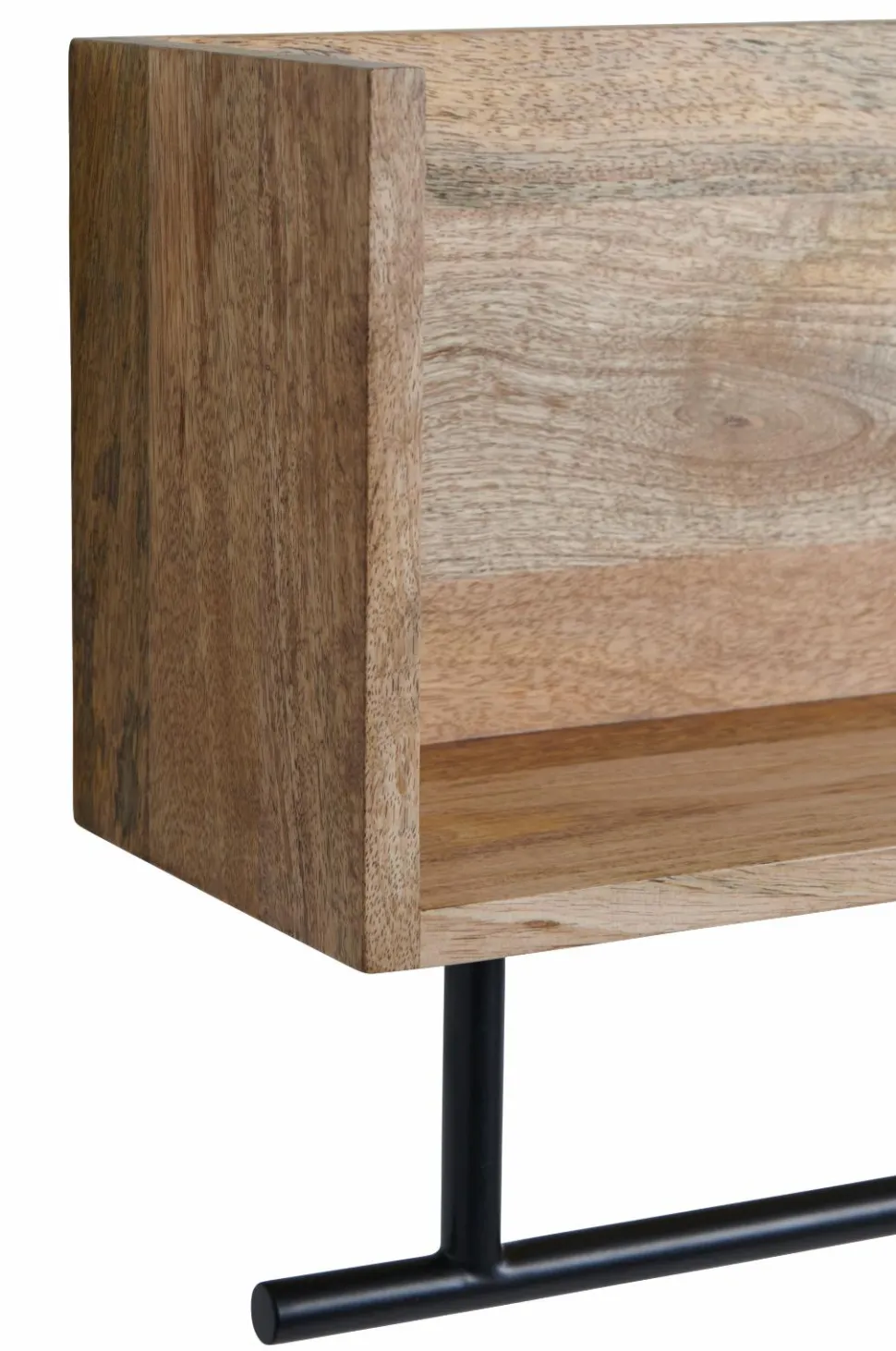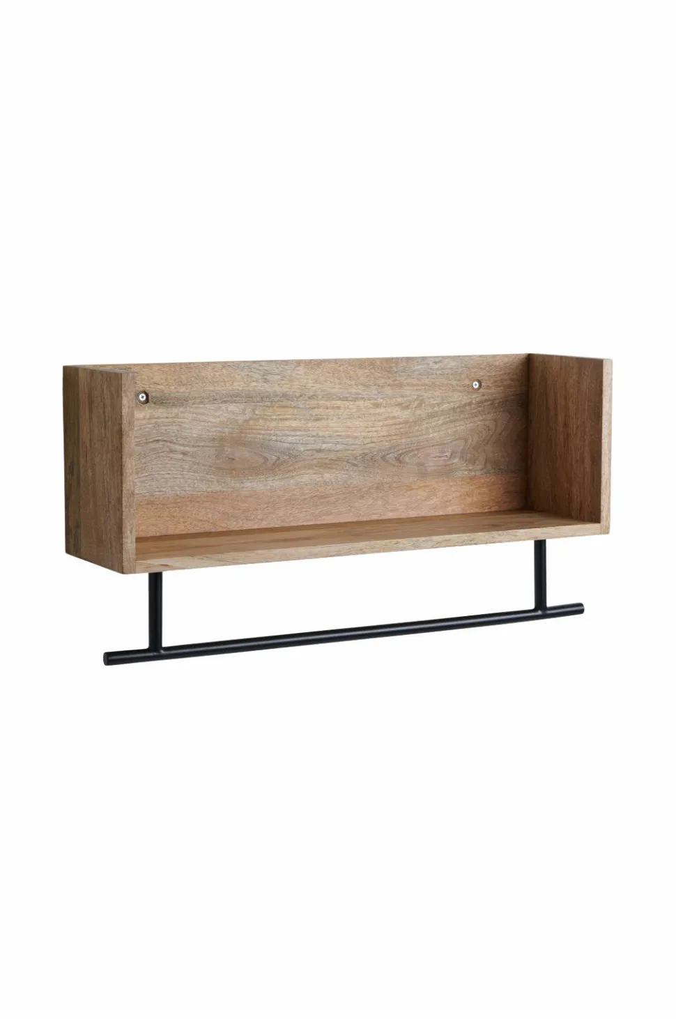 Væghylde af mangotræ med metalknager til f.eks. bøjler, håndklæder eller S-kroge (medfølger ikke). Produktet indeholder FSC-certificeret træ, som er fældet i et ansvarsfuldt skovbrug, der tager hensyn til mennesker og miljø.