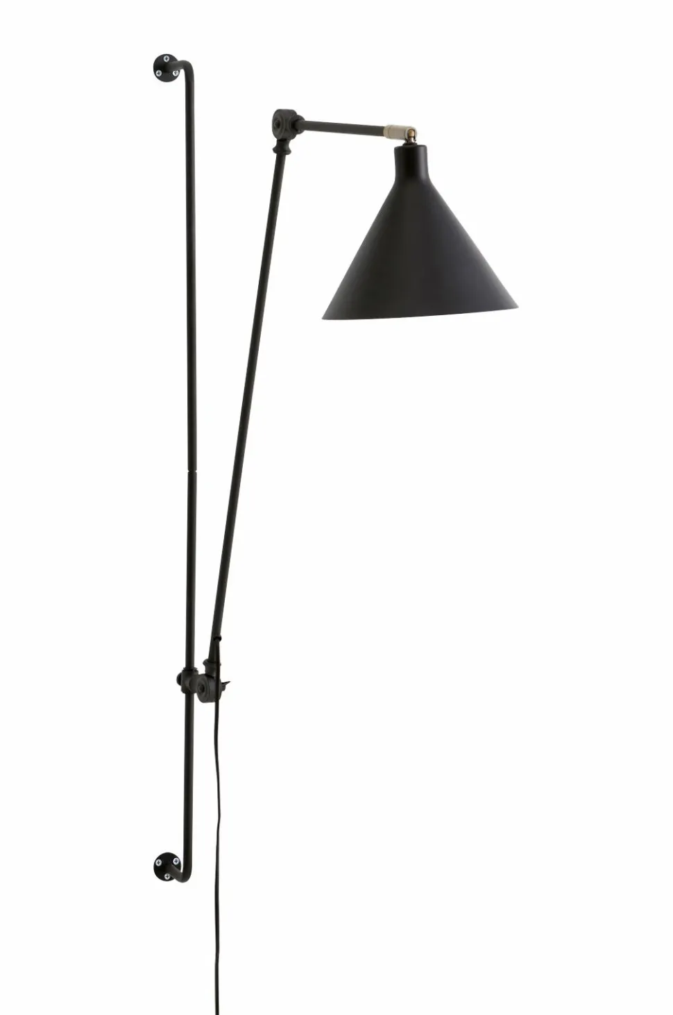 Væglampe i pulverlakeret metal, monteret på et vægbeslag med højden 100 cm. Den lange arm, som holder lampeskærmen, kan justeres opad og nedad. På den lange arm sidder en lille, justerbar arm som holder lampeskærmen. Skærmen har hvid inderside og er justerbar i højden og til siden. Hele lampen kan justeres på vægbeslaget i højden og til siden. Længde på armene er hhv. 60 og 20 cm. Mål på skærm: højde 17 cm, Ø 20 cm. Maks. totallængde fra væg 118 cm. Plastledning med afbryder, ledningslængde 2 m. Stor sokkel E27. Maks. 25 W. Pære medfølger ikke.