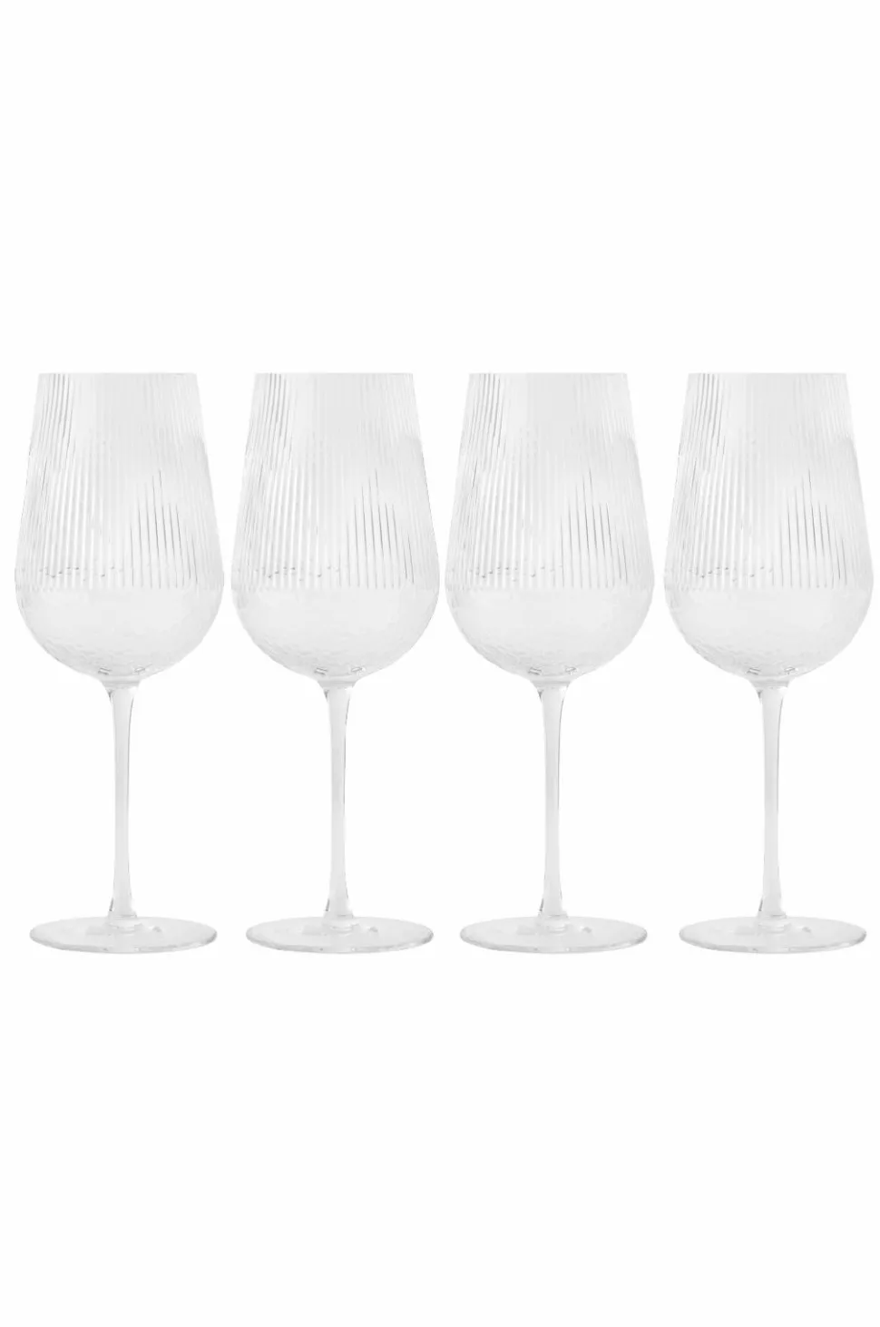 4 stk. vinglas. Højde 23,5 cm. Diameter foroven 6,5 cm. Diameter fod 8 cm. Volumen: 460 ml. Tåler opvaskemaskine men ikke mikrobølgeovn.