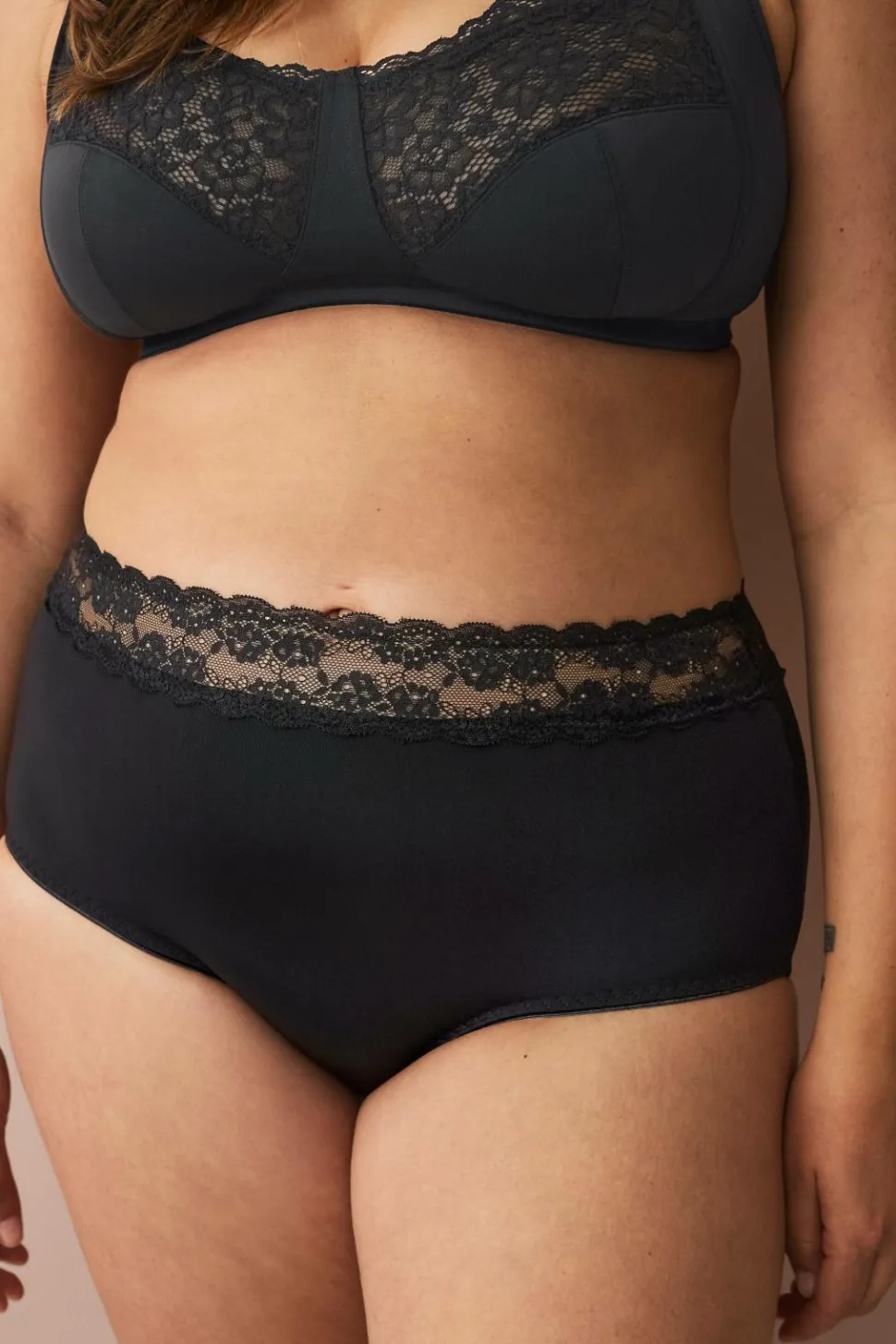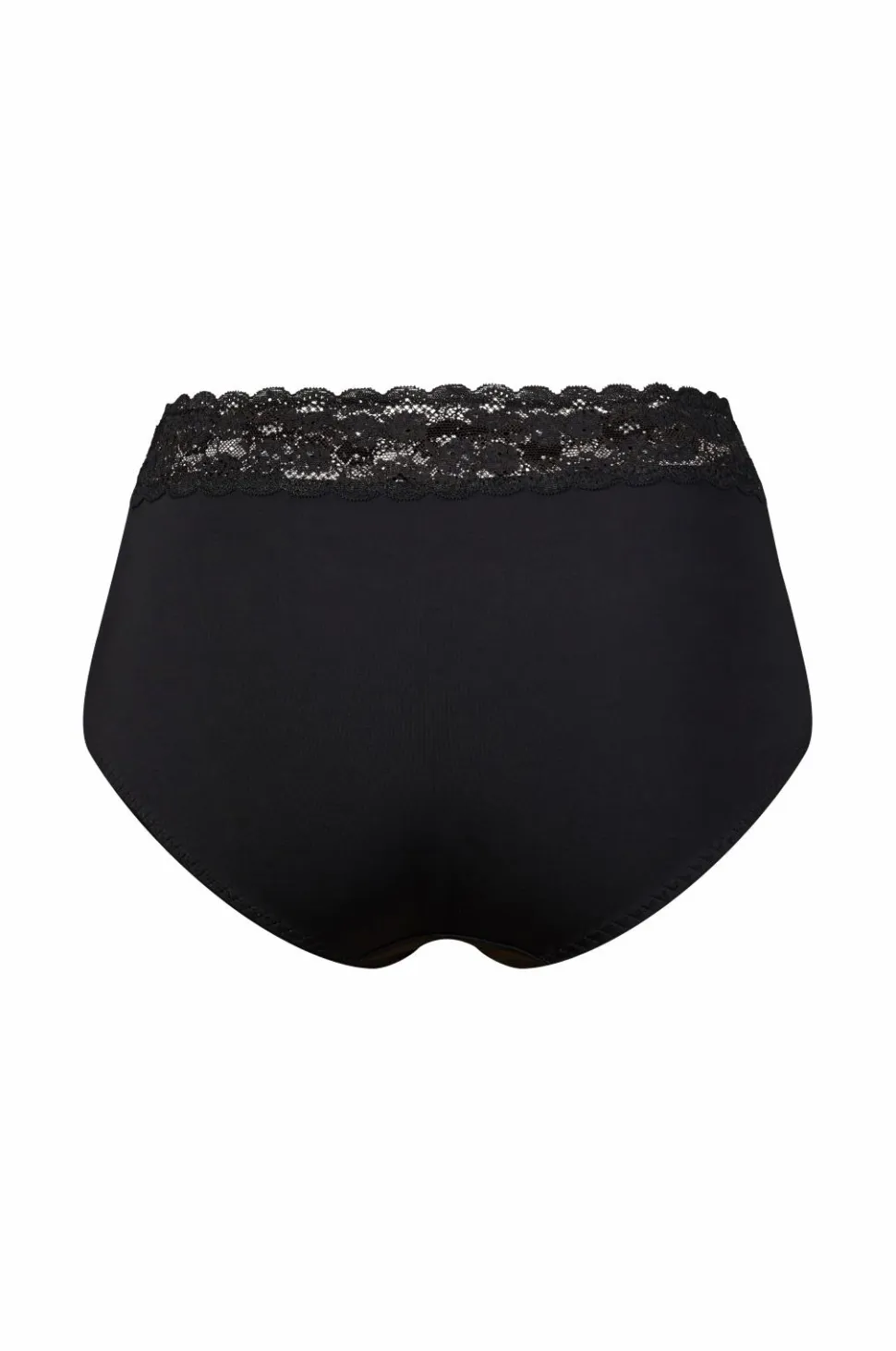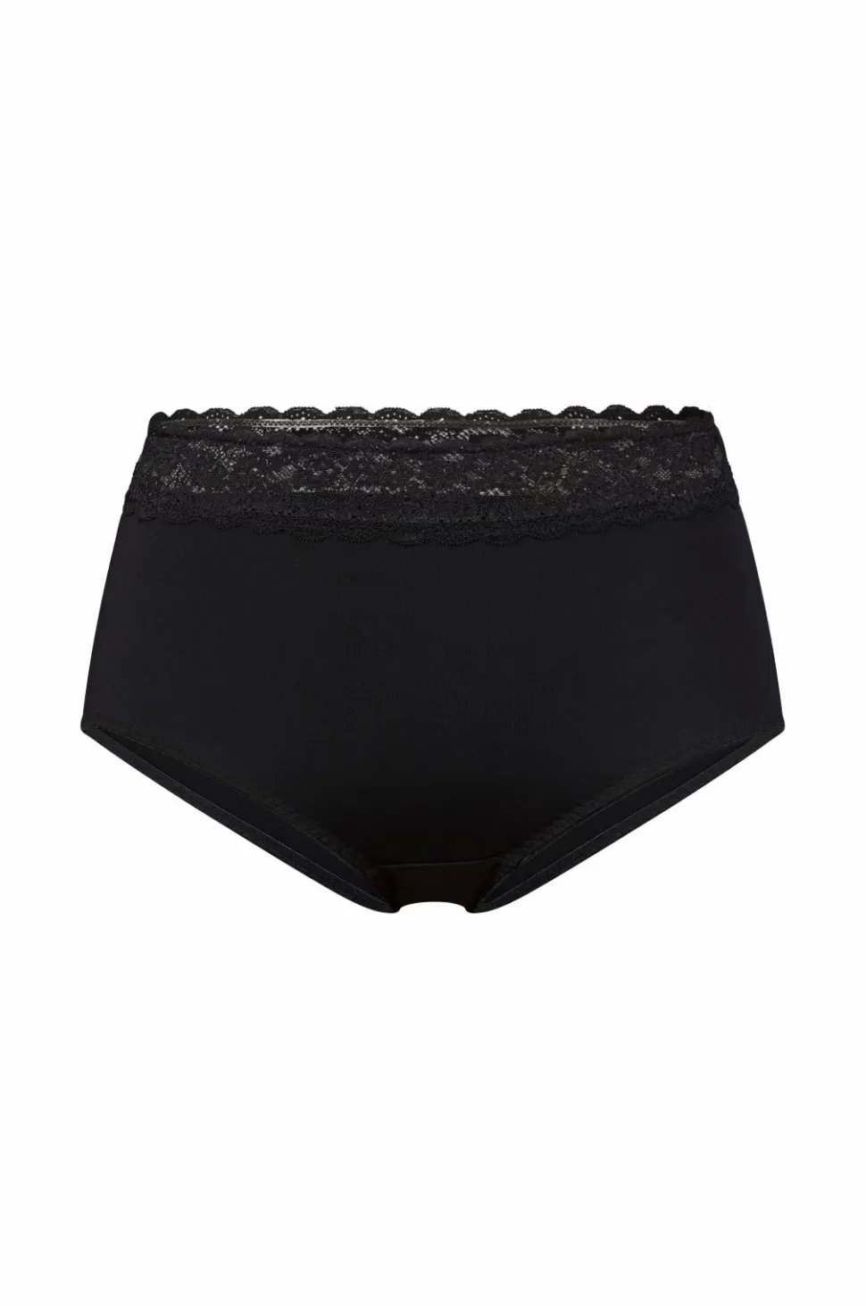 • Maxitrusse i en behagelig, høj model med påsyet blondeelastik foroven. Blød elastik i taljen med piping også ved anklerne og dobbelt skridt. Højde i siden (inkl. blonder) ca. 16 cm i størrelse 34/36.