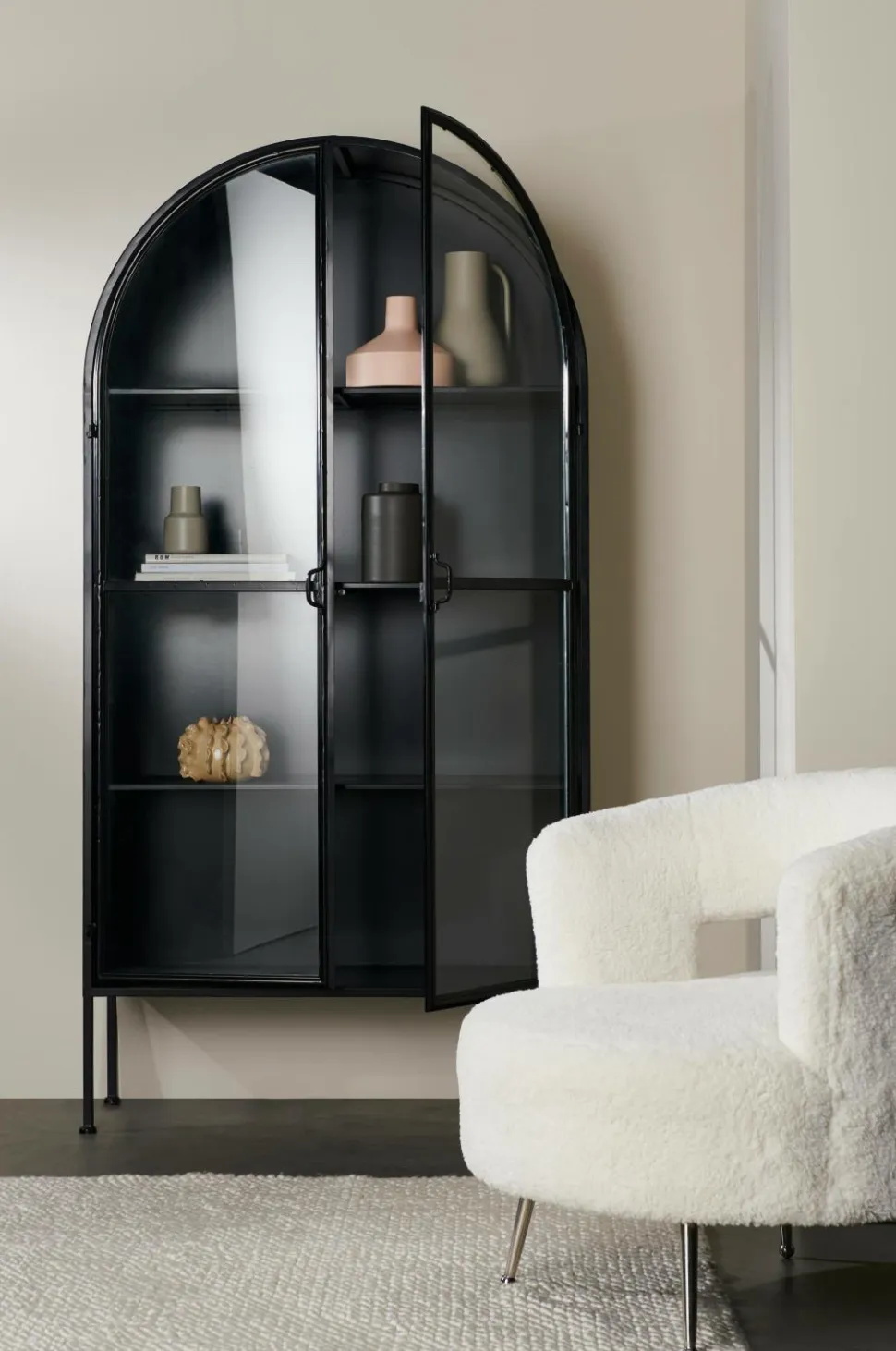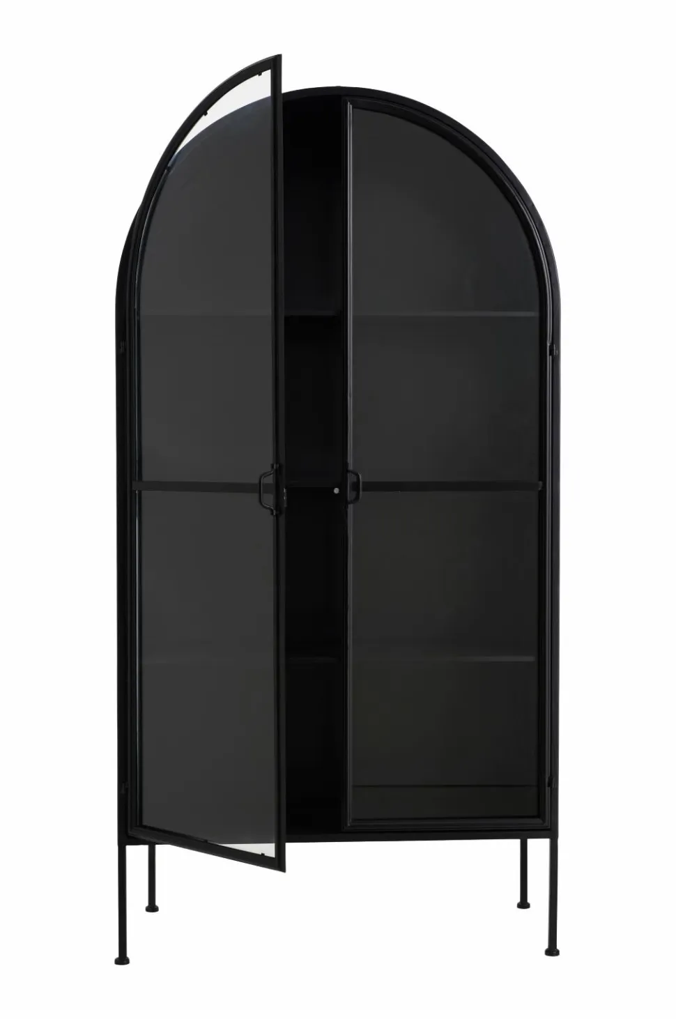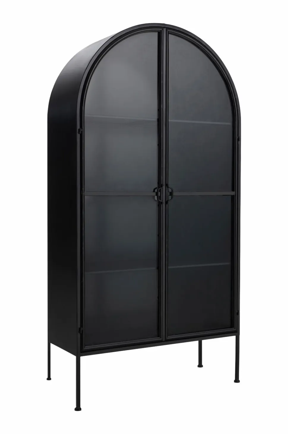 Hvælvet skab i metal. To låger med metalramme og hærdet, klart glas. Lågerne har magnetstop. 4 faste hylder i metal. Maks. vægt 10 kg/hylde. Hul på bagsiden til montering på væggen. Mål: Bredde 100 cm, højde 197 cm, dybde 40 cm. Benhøjde 26,5 cm. Hyldens indvendige mål 37 cm x 97 cm. Ca. 37 cm mellem hylderne. Leveres samlet.