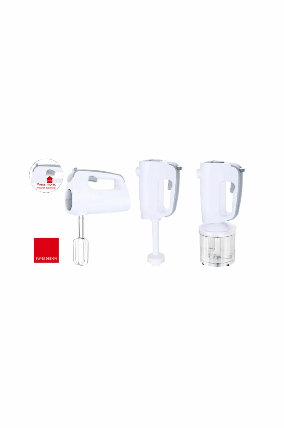 Med et praktisk elpiskeris som basis er det muligt at piske, blande og hakke. En traditionel elpisker, en stavblender og en skål til at hakke i giver stor valgfrihed i ét og samme køkkenredskab. Med en effekt på 300 watt får du et hurtigt resultat, når du pisker, blander eller hakker.