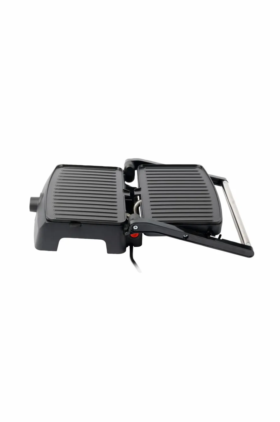 kontaktgrillen er elegant i sort og sølv og smart designet med et bevægeligt låg, der kan åbnes 180 grader, og som tilpasser sig madens tykkelse. Temperaturen på grillen kan justeres, et lys indikerer varmen, og den er nem både at bruge og rengøre.