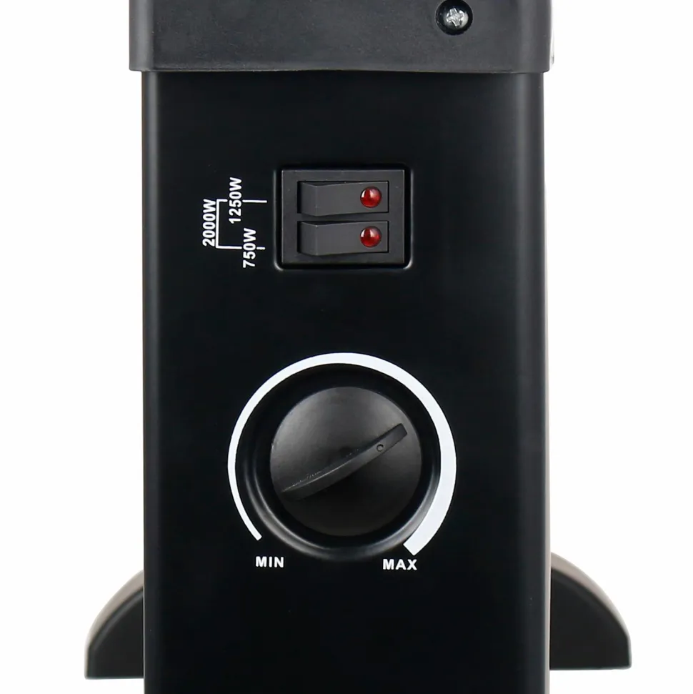 Konvektionsvarmeapparatet har tre effektniveauer (750 W, 1250 W og 2000 W) og justerbar termostat så du kan ændre temperaturen efter behov.