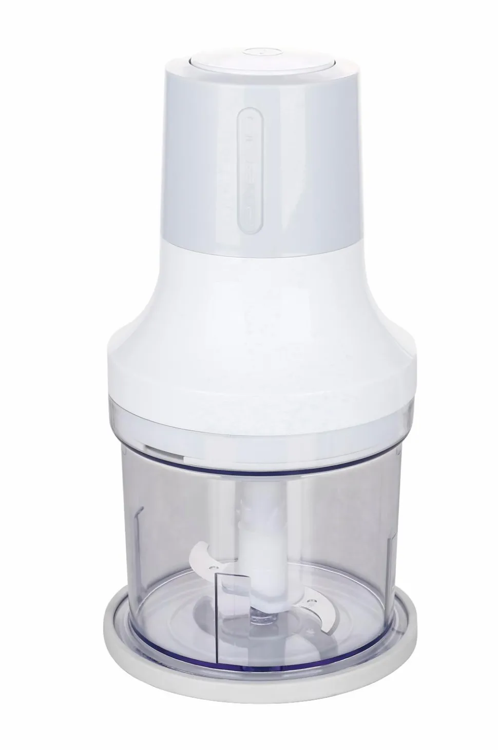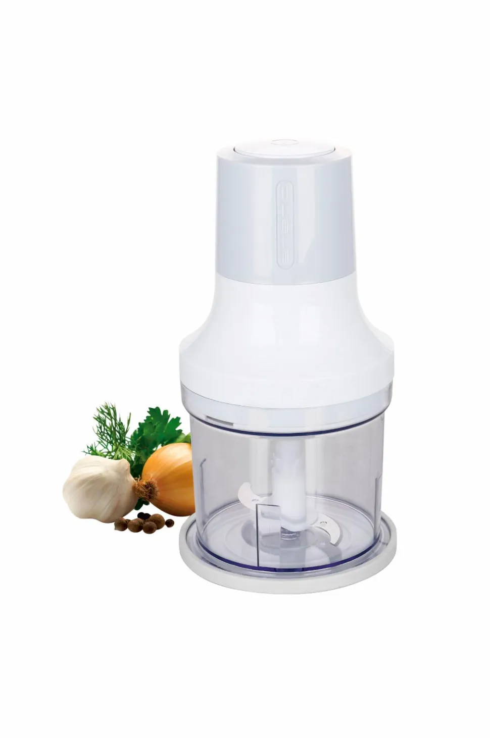 Designet er moderne og smart med en 5 dl plastbeholder og knive i rustfrit stål, og bunddelens skridsikre beskyttelse kan også bruges som låg til opbevaring.