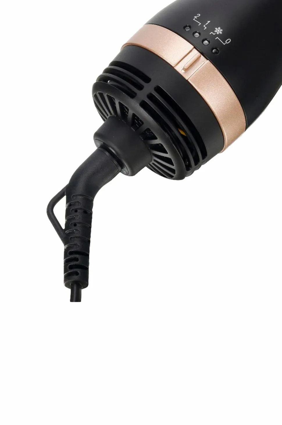 Designet er stilfuldt i sort og guld og har tilbehør til alle tænkelige frisurer. Varmluftbørsten har to varmevalg og to hastigheder. Med den smarte ledningsoprulning og ophængningsstrop er den nem at opbevare uden sammenfiltring.