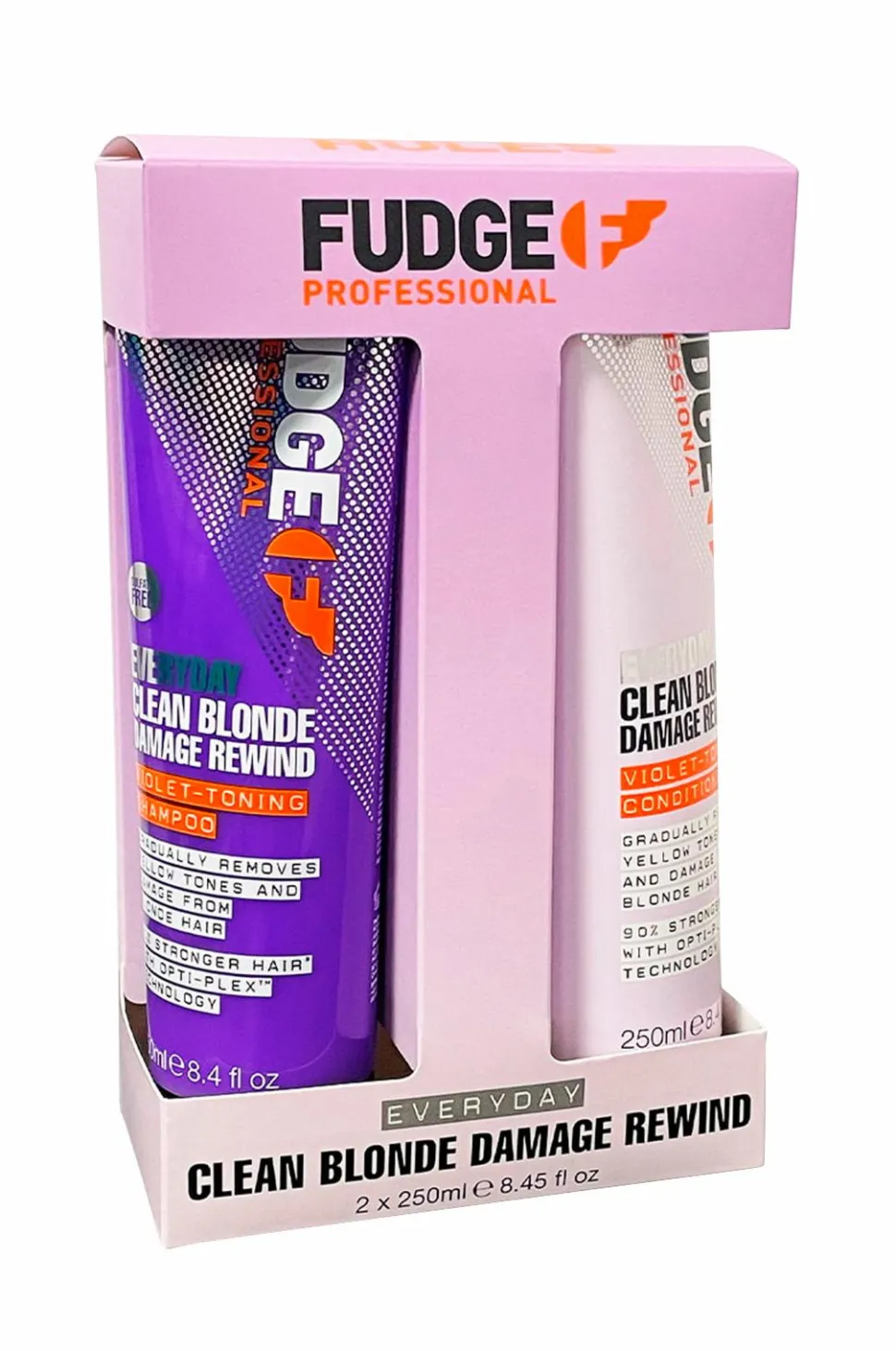 Everyday Clean Blonde Damage Rewind Violet Duo er en shampoo og balsam, der gradvist fjerner gule toner i blondt hår. Designet til daglig brug for at bevare en salonfrisk nuance. Beriget med Opti-plex™-teknologi, der styrker og beskytter håret for at holde det i perfekt stand, samtidig med at det reparerer skader forårsaget af kemiske behandlinger og varmeredskaber. Opti-Plex indeholder hydrogeneret vegetabilsk protein, der styrker håret både indefra og udefra og efterlader det stærkere, mere glansfuldt og med et glattere skællag.